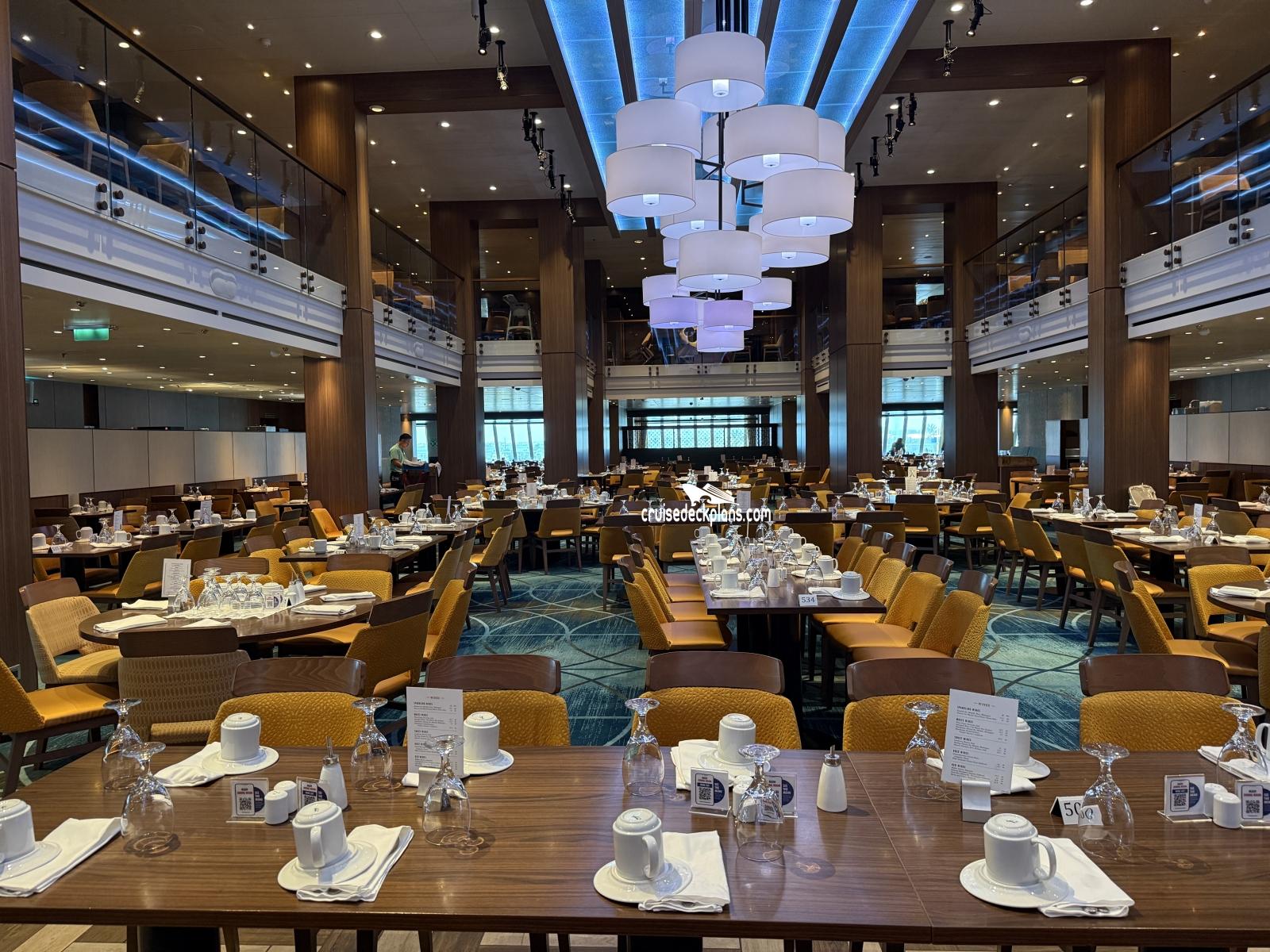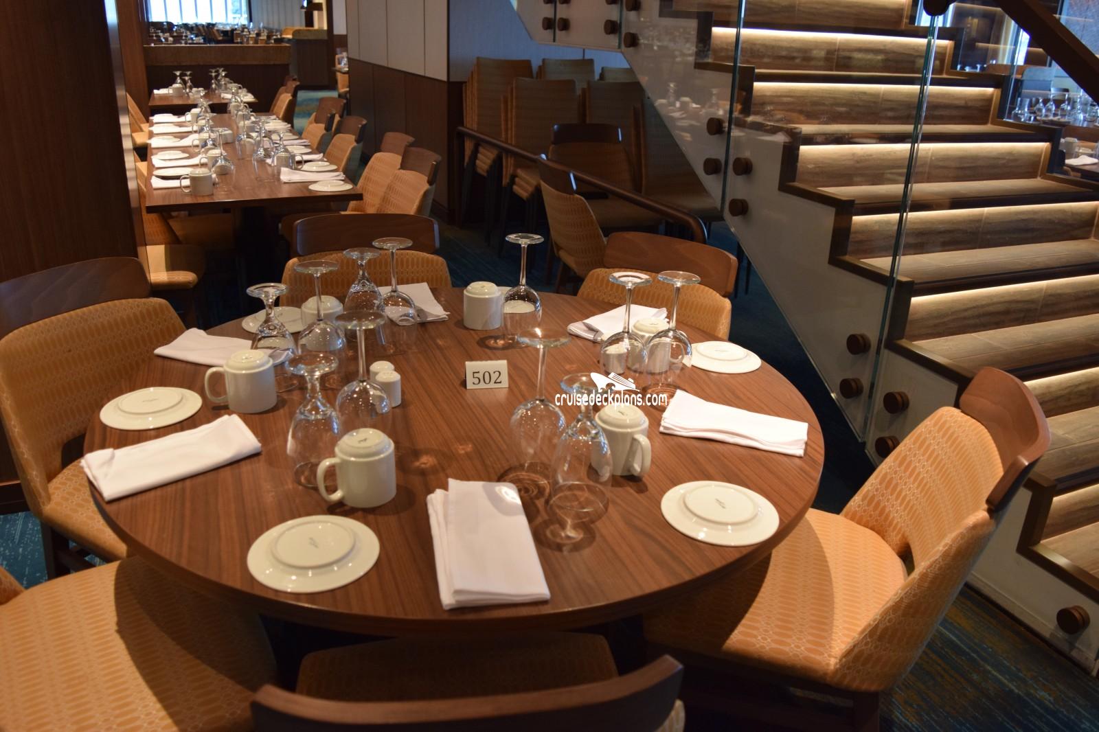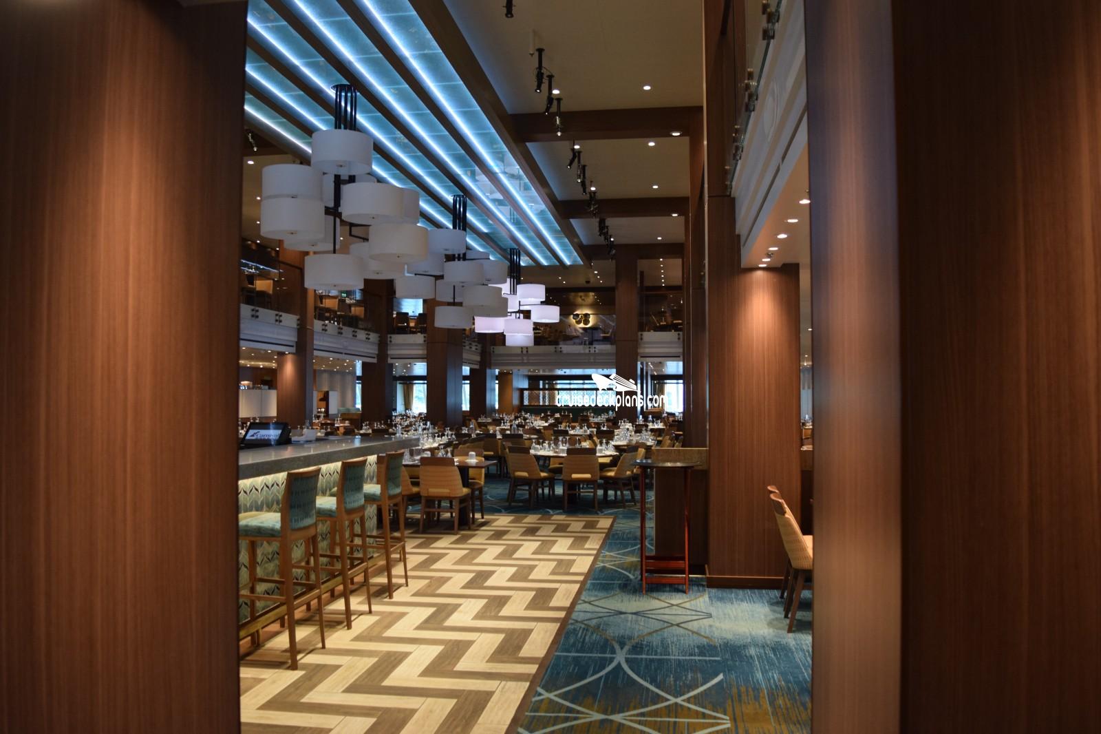 The ships main restaurant located in the aft of deck 3 and deck 4. Two levels. Offers sit-down waiter service. There is also a sit-down bar near the entrance for guests waiting to be seated. Open nightly for open dining at 5:45 p.m.