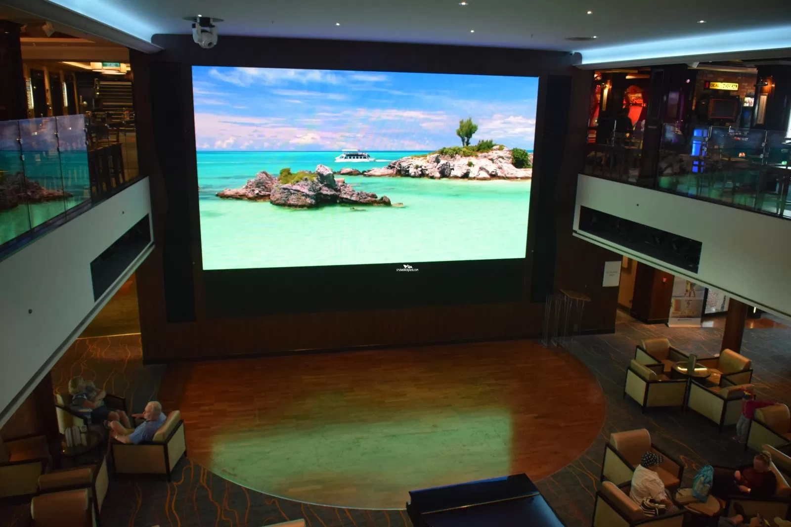 Two deck high atrium with its large open seating area at the base of the atrium on deck 6 and a giant screen used for airing live sporting events, movies and open Nintendo Wii gaming. In Atrium is guest services desk, cruise consultant, internet cafe.