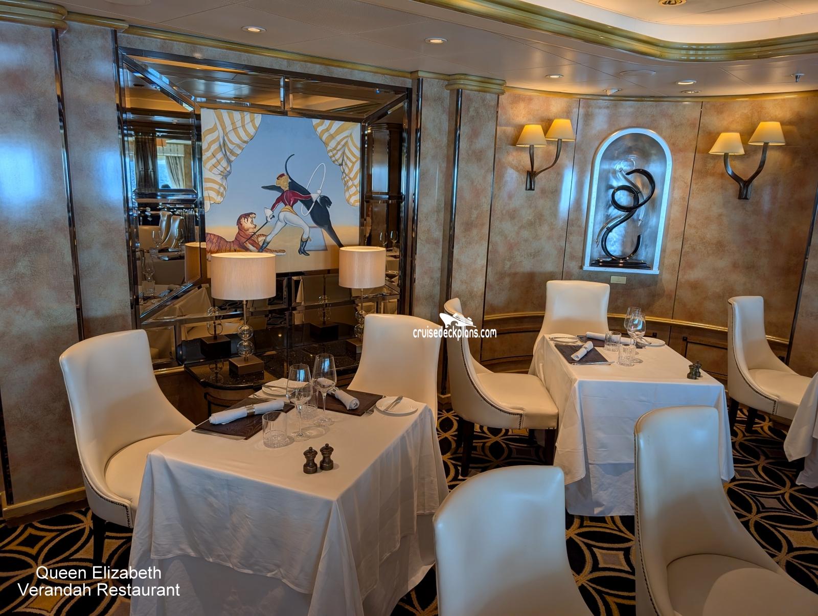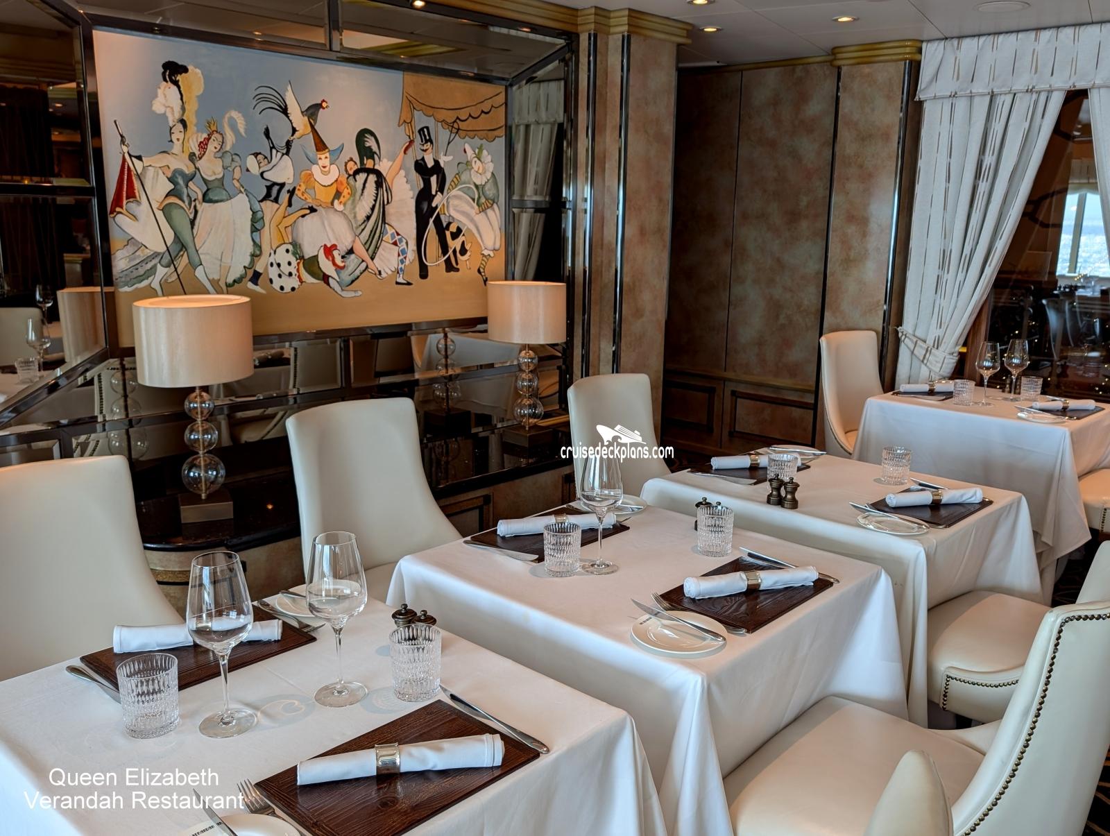This page shows actual pictures for Queen Elizabeth The Verandah Restaurant. Most of our pictures are contributed by actual cruisers. You will find that all the Queen Elizabeth The Verandah Restaurant pictures on this page also posted directly onto our deck plans near the actual location the photo was taken. You can browse the pictures here or you can click on them as you are viewing the Queen Elizabeth deck plans. For deck plan viewing click on the ship button above or scroll down to view the pictures on this page.