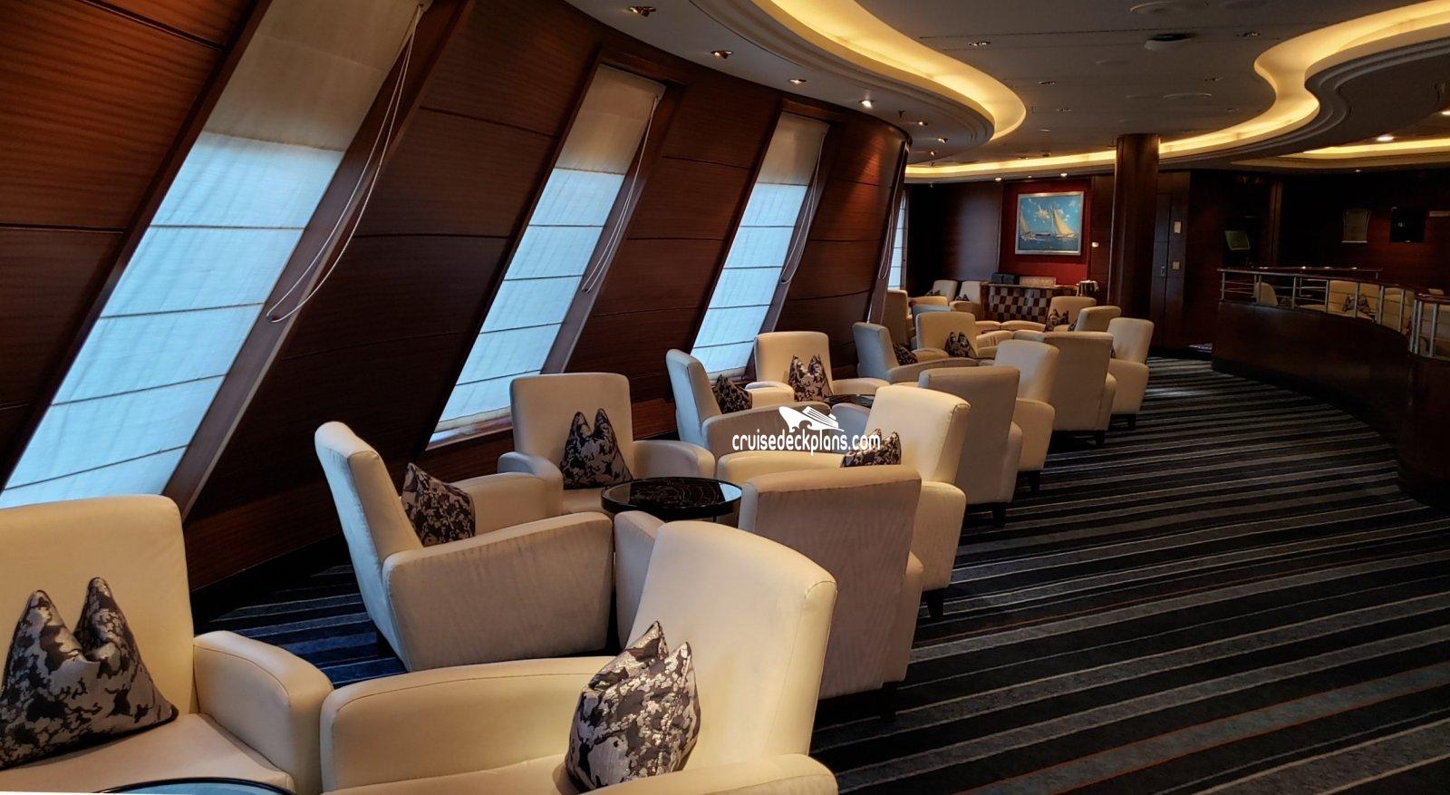 Overlooks the bow of the ship, providing panoramic views as you sail towards the horizon. An extensive selection of martinis are available with soft relaxing music from the resident pianist.
