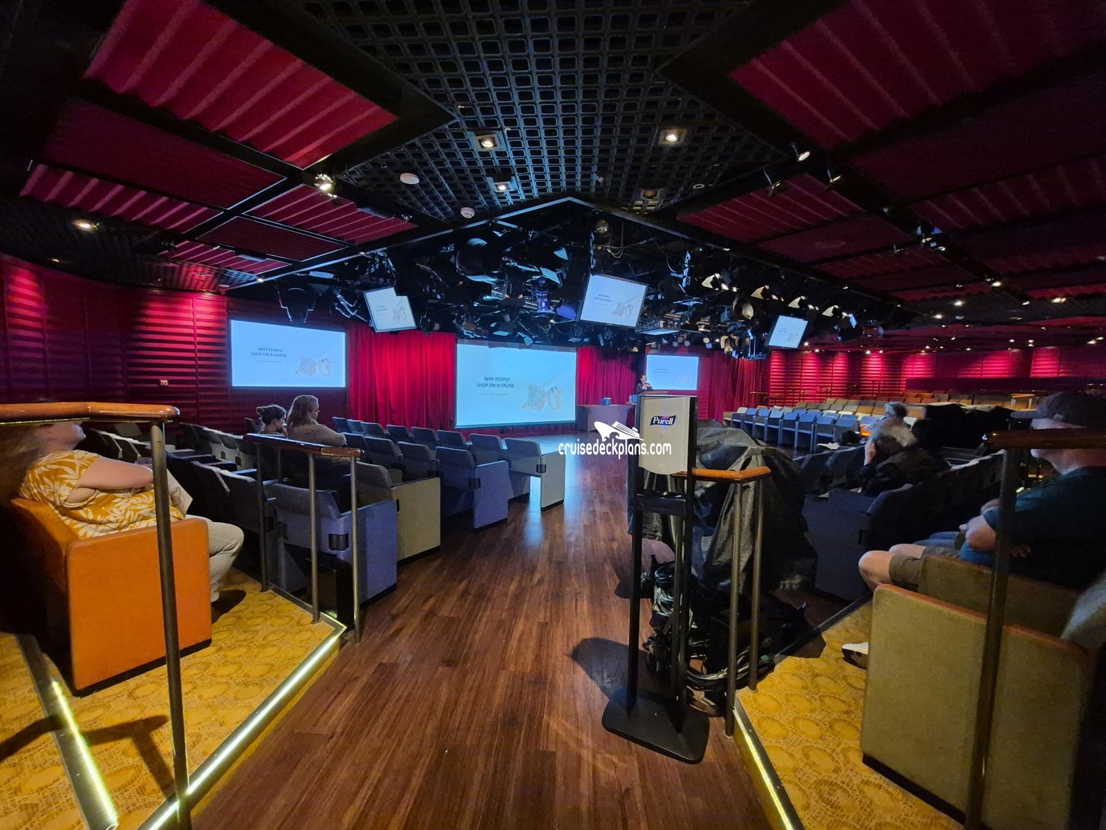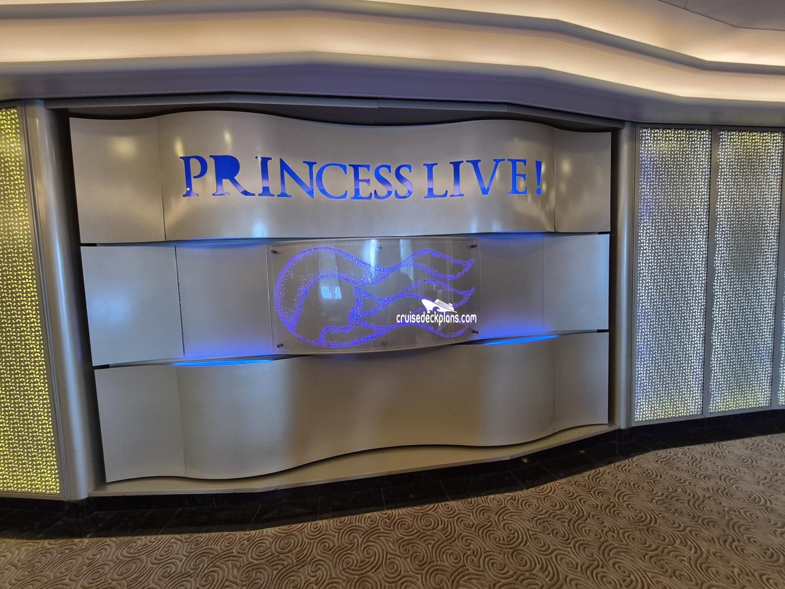 A TV studio where guests get the chance to experience what it feels like to be in the audience during the filming of TV shows. Princess' "The Wake" show will be filmed daily and broadcast to staterooms along with audience participation game shows which will also be broadcast to rooms the following day. The venue will also be used for live musical performances giving audiences a more intimate interaction with the artists. Refreshments are available from the adjoining Princess Live Cafe.