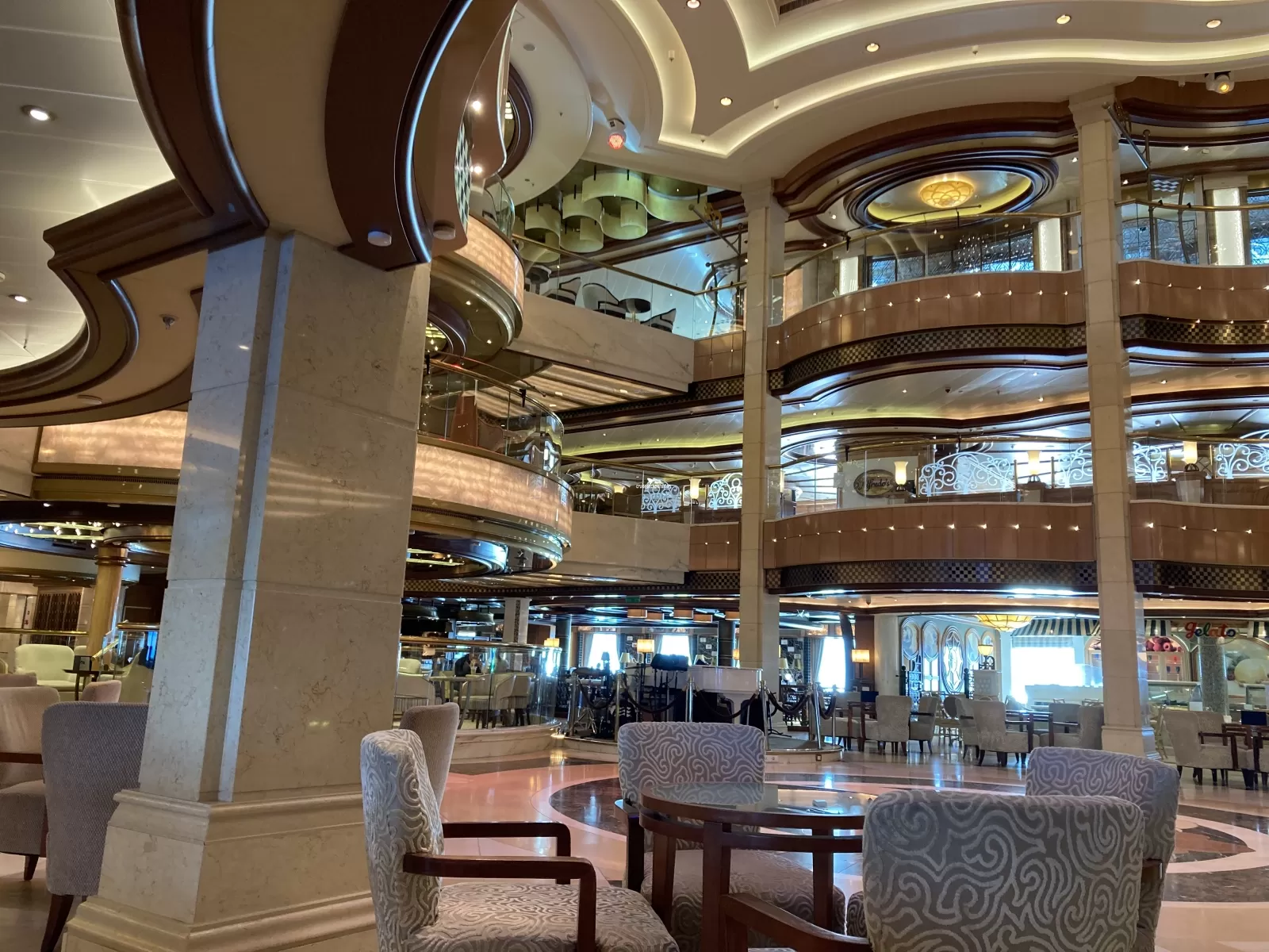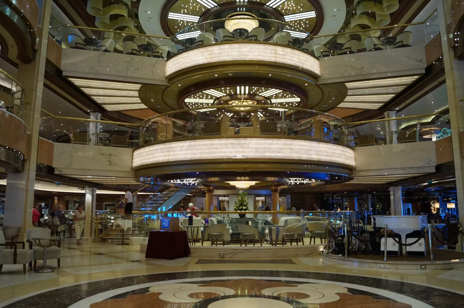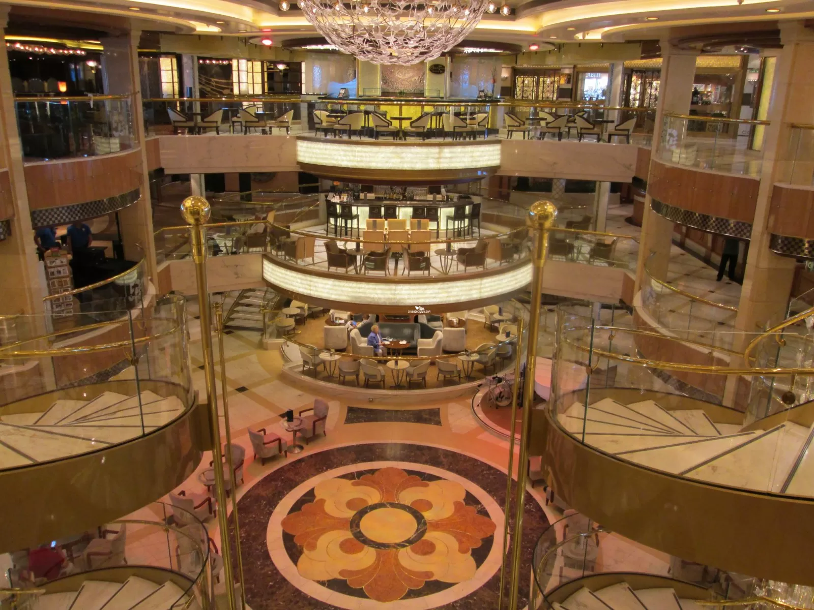 The central hub of the Royal Princess, featuring a three deck glass atrium and two sweeping marble staircases lit by lines of light descending from the apex down to the water features below. There is a stage featuring a variety of entertainment during the day and night from musicians and performers to demonstrations.