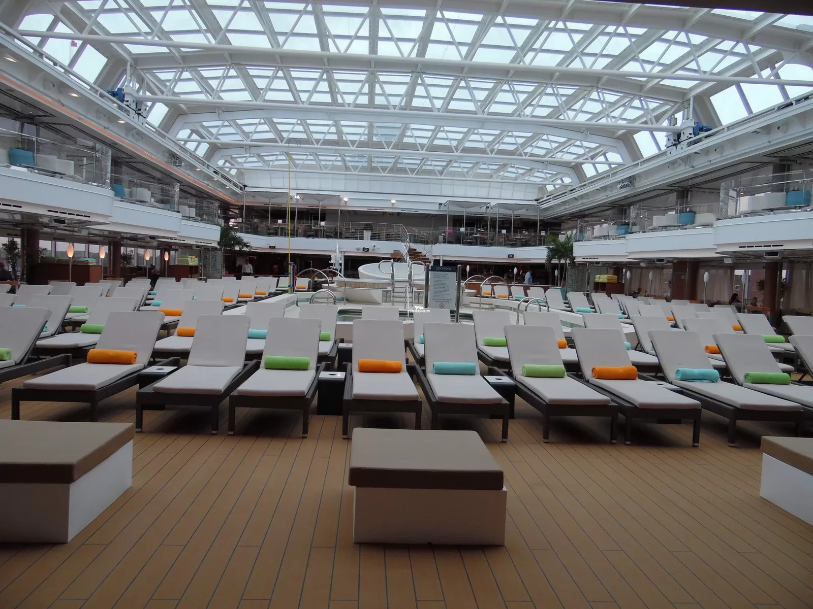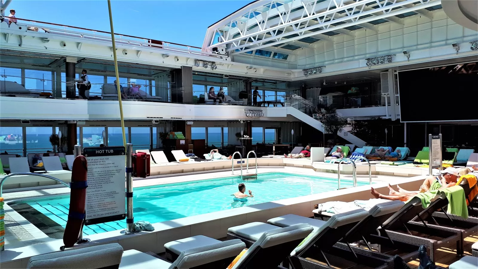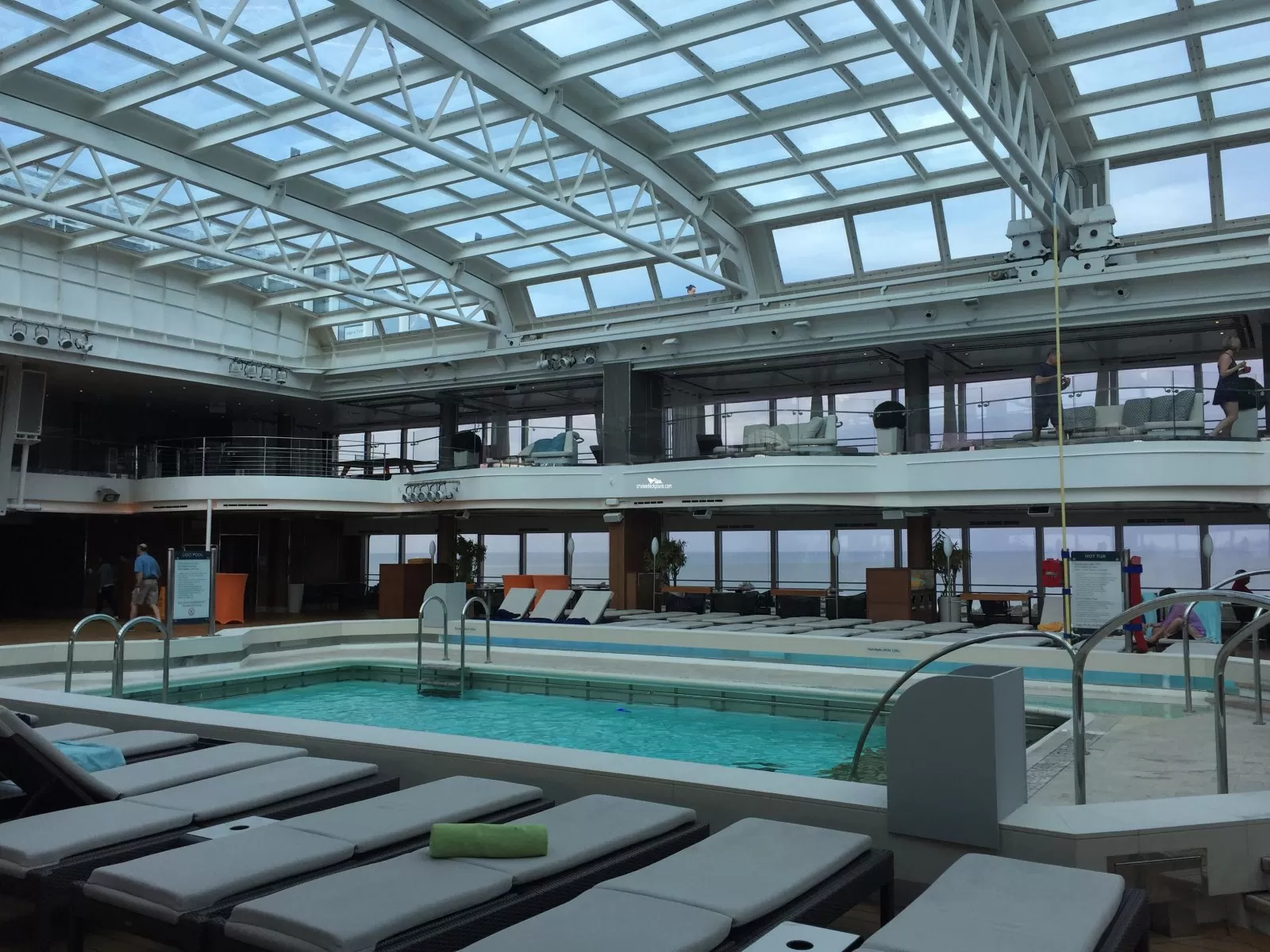 Glass enclosed with retractable roof. Pool has 3 whirlpools and is serviced by Lido Bar.