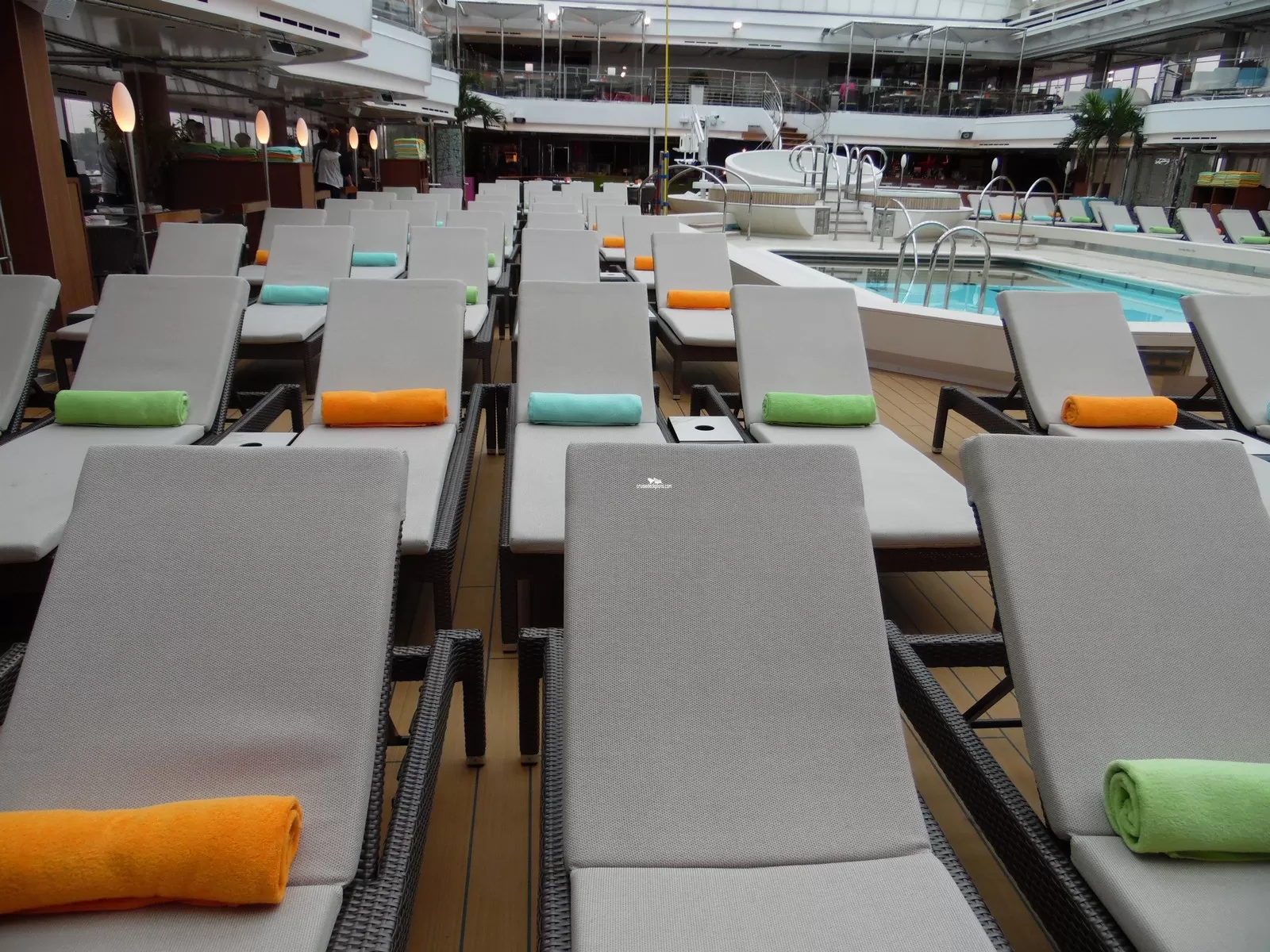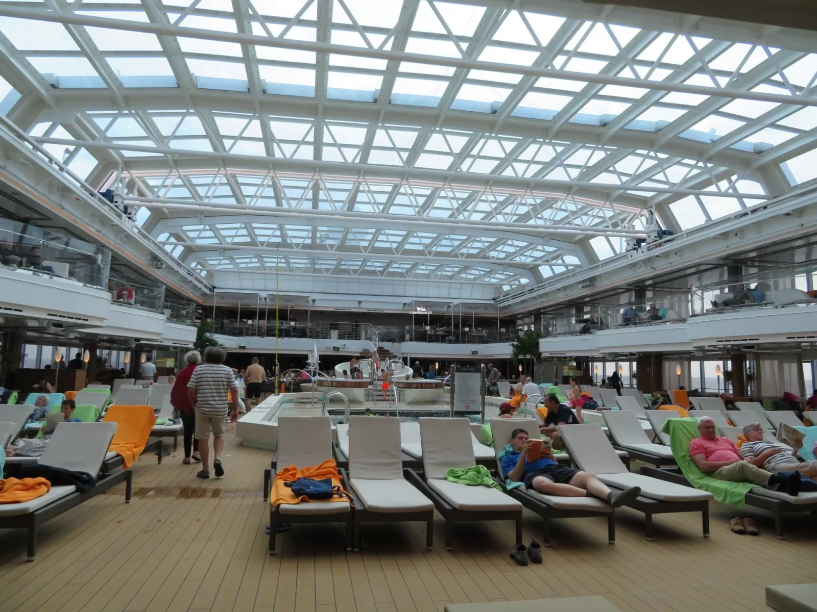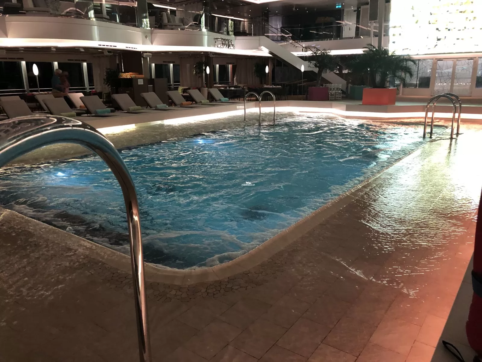 Glass enclosed with retractable roof. Pool has 3 whirlpools and is serviced by Lido Bar.