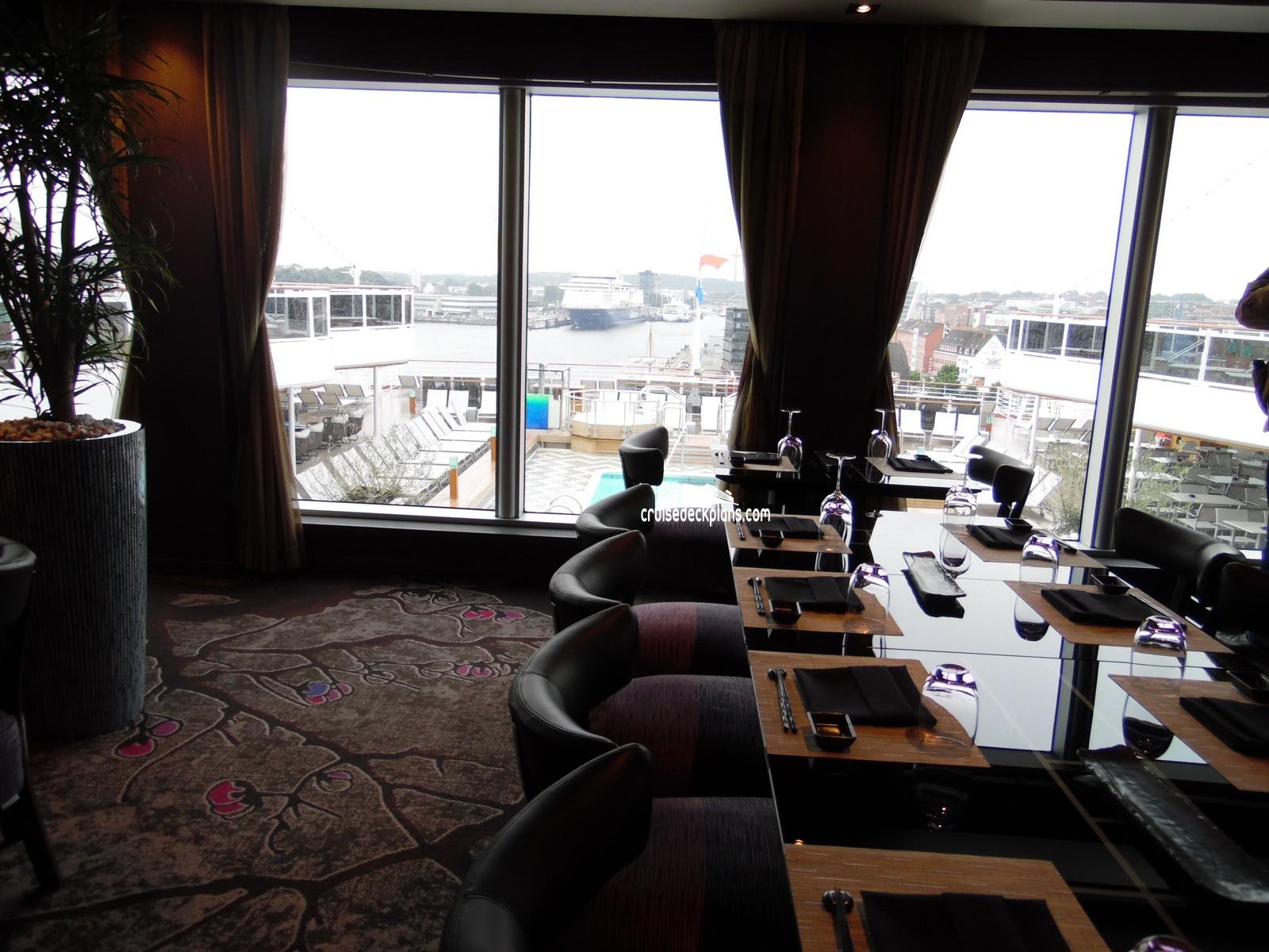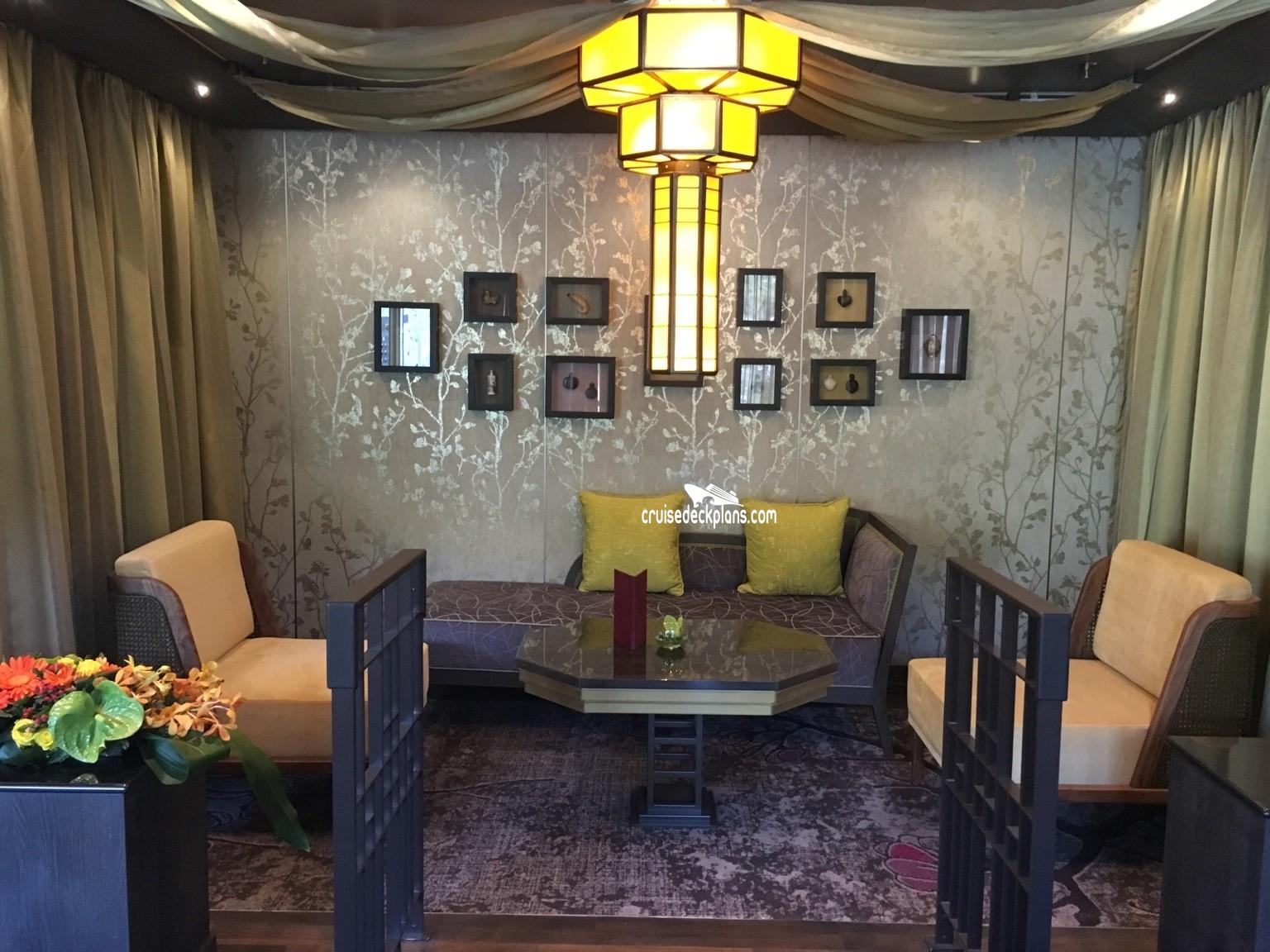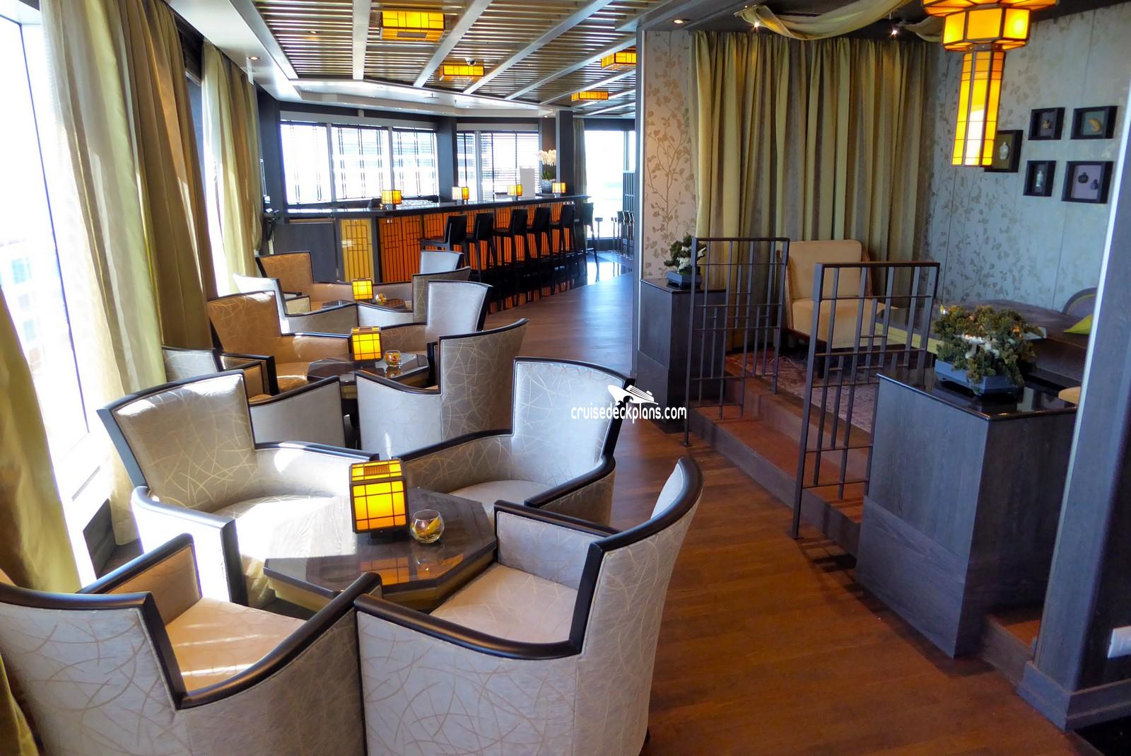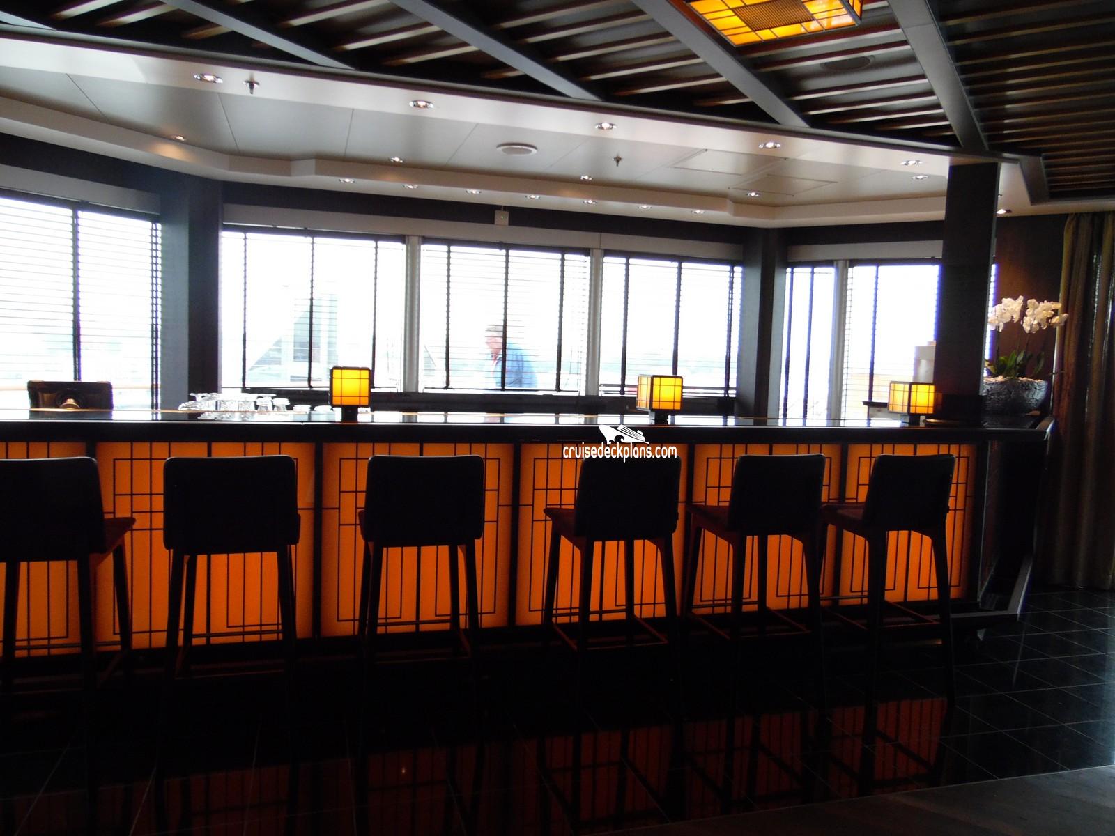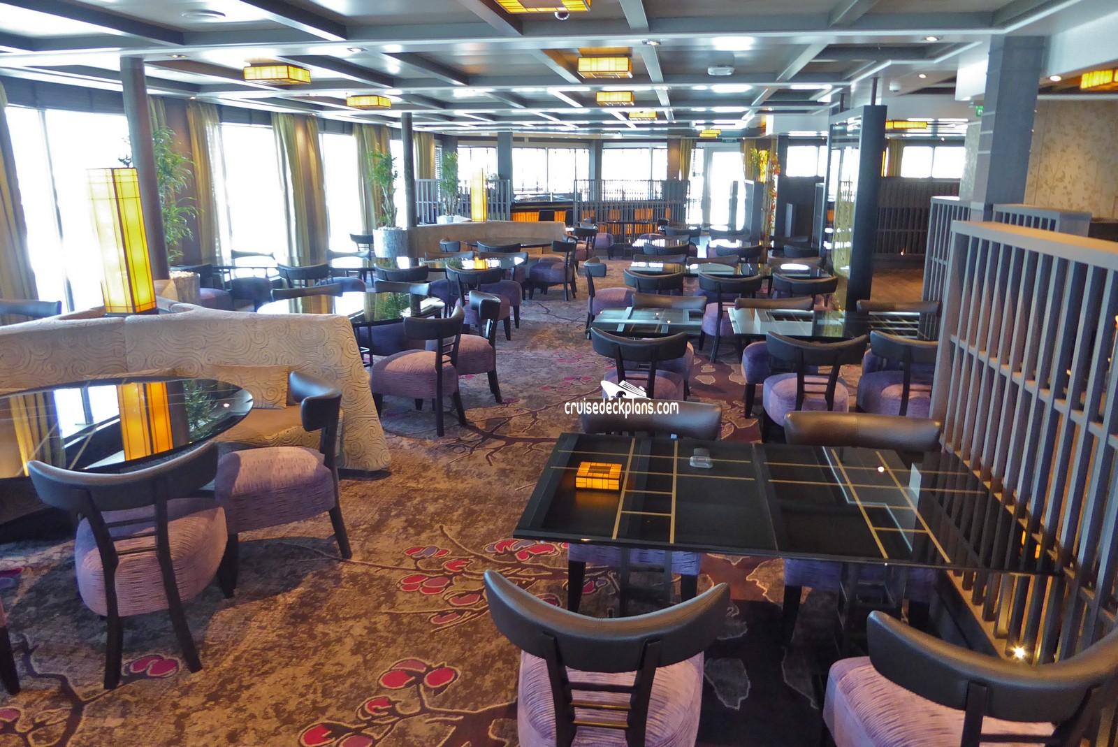Reservation only Asian restaurant (surcharge required for dinner, but serves a complimentary lunch). Seats 140 people. Sushi bar with 7 seats for lunch and dinner (surcharge required).