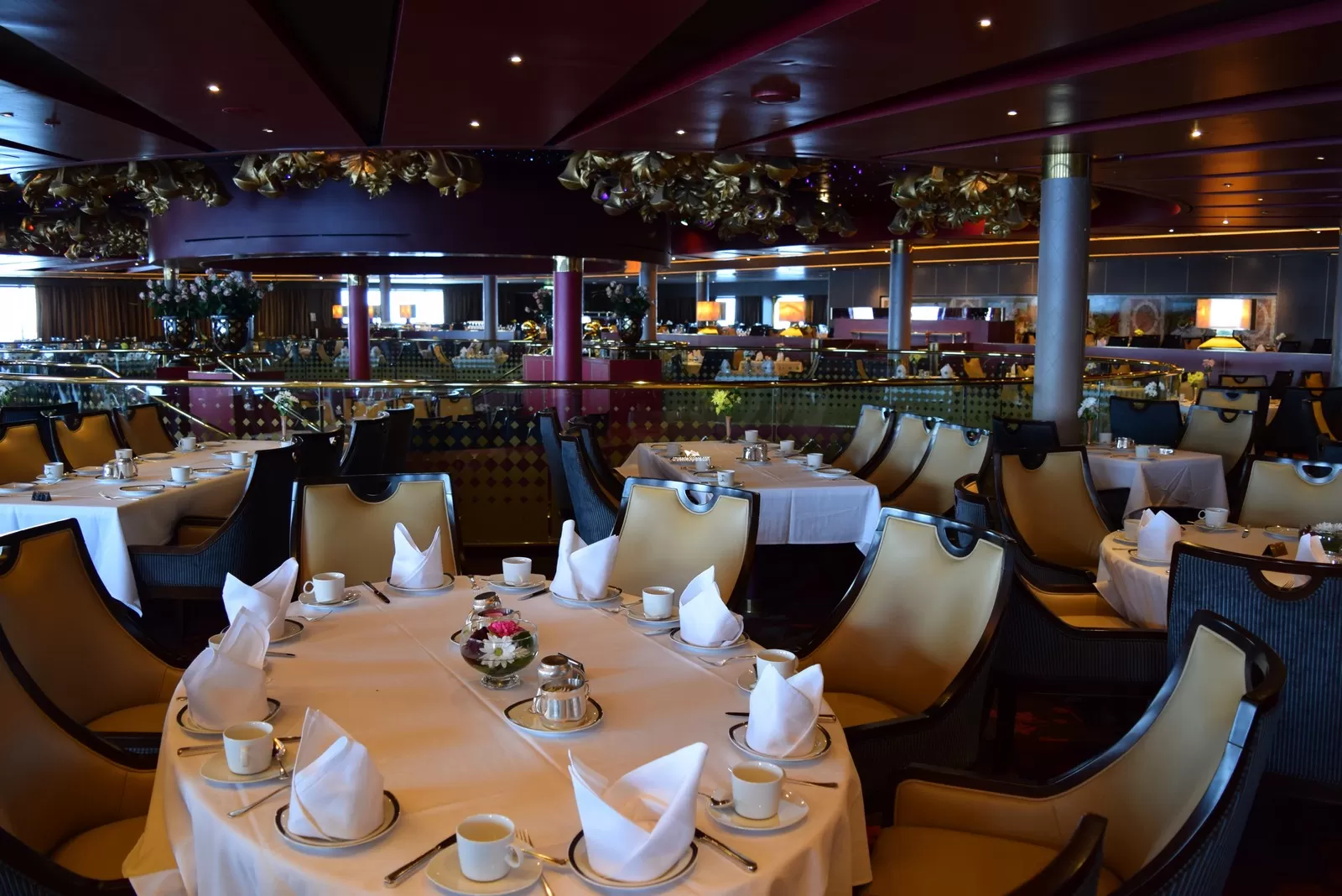 The ship's Main Dining Room located over 2 tiers on decks 2 and 3. Open for breakfast, lunch, afternoon tea and dinner, the restaurant offers a choice of either traditional pre-set seating and dining times or the ships "As You Wish" freedom dining.