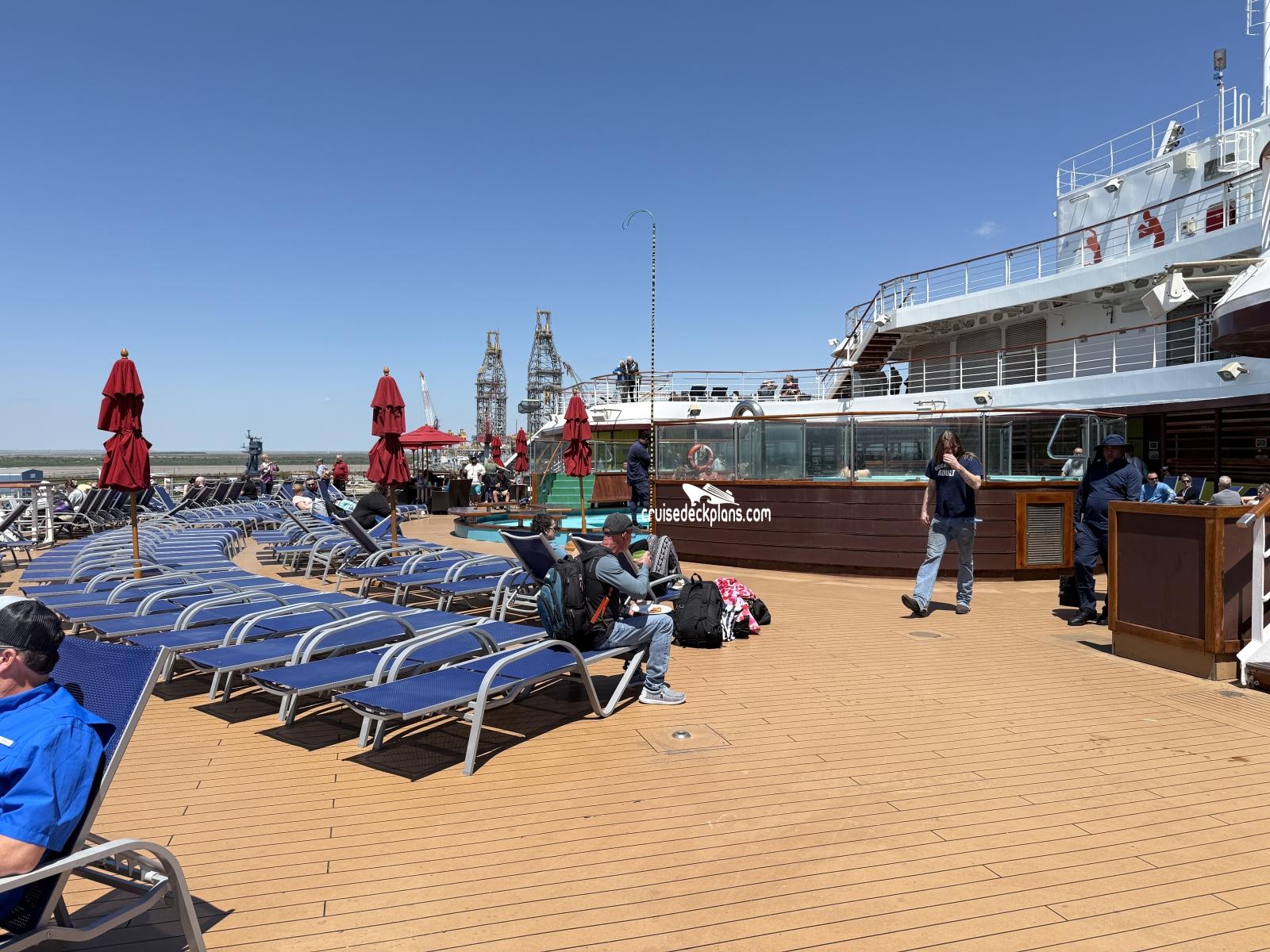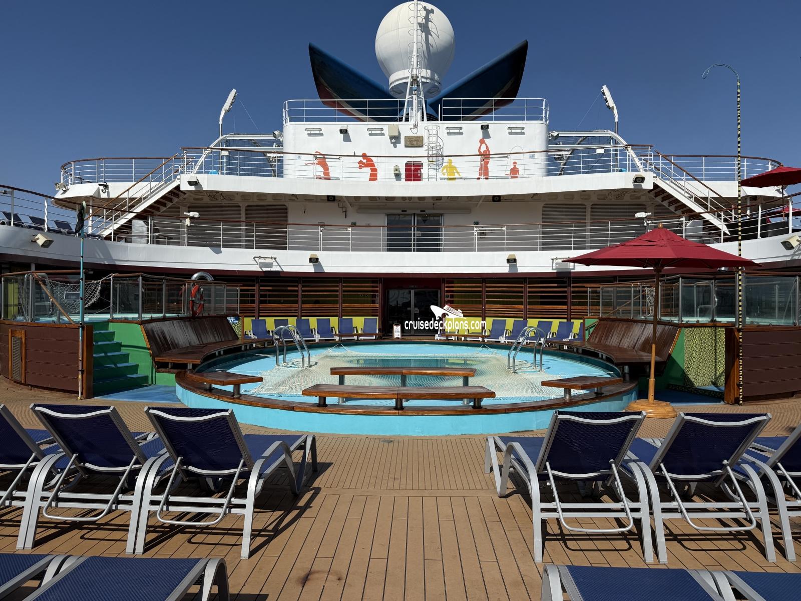 Aft pool with 2 hot tubs. Typically opened from 8:00 a.m. to midnight. Saltwater pool that is 21 feet long and 16 feet wide. It is 4 feet 6 inches deep.