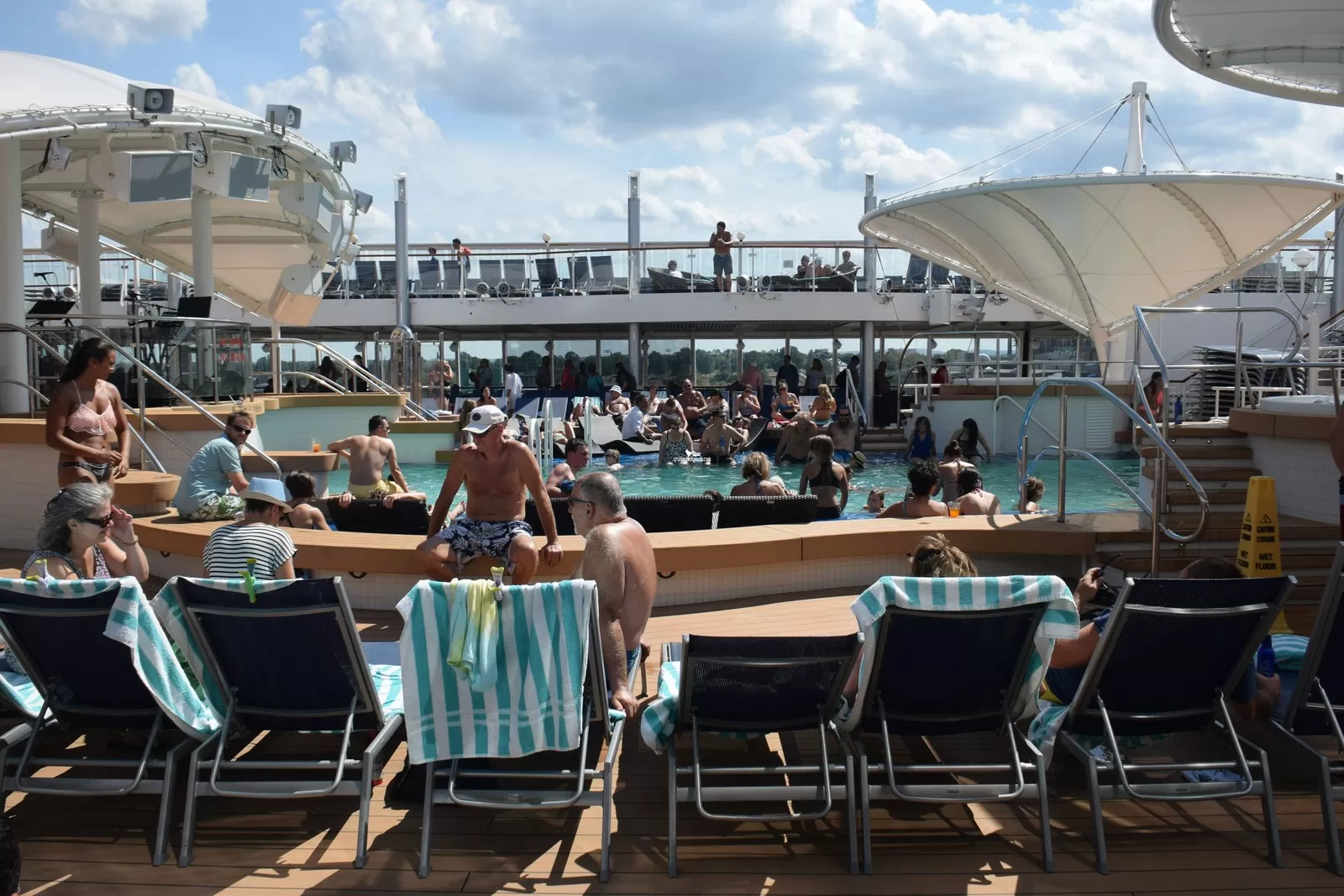 Large pool with 4 hot tubs and statium style lounge chairs. Nearby bar and ice cream bar. This is the place the ship also has out door cook outs.
