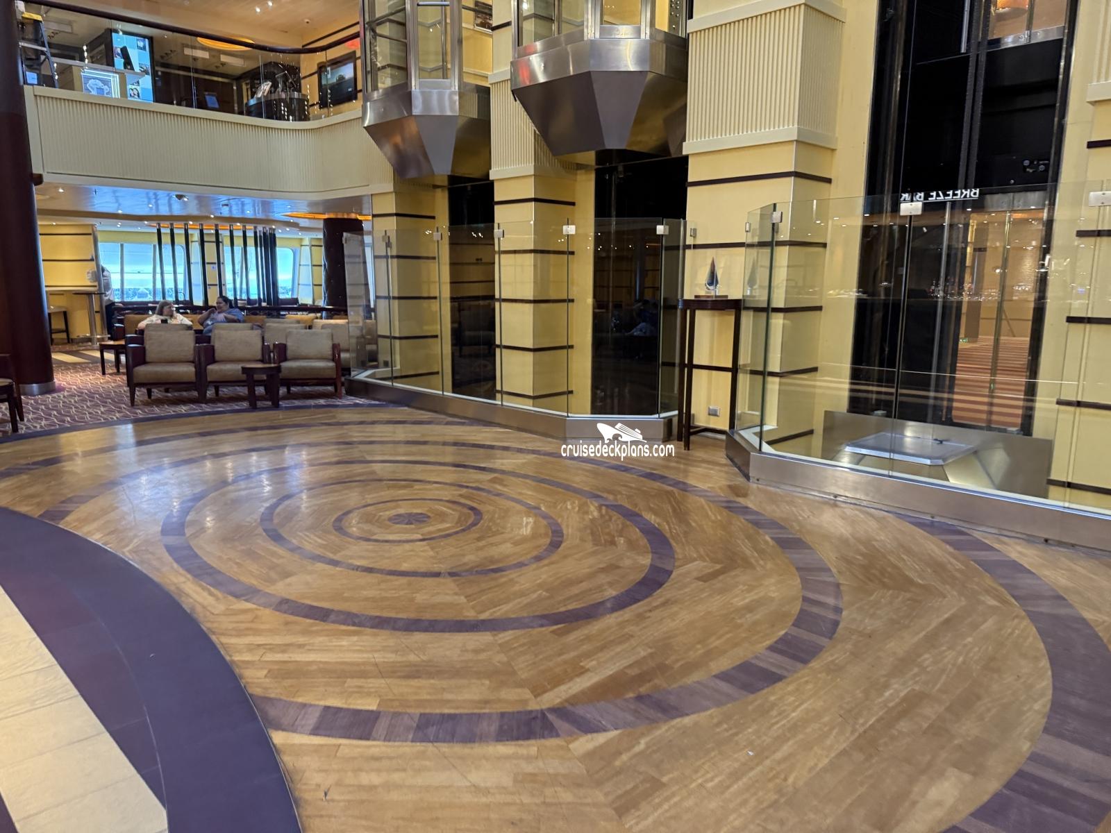 Ships atrium. On first level is dance floor and bar, lounge area, guest services desk, shore excursion desk. This is one of main entrance areas of the ship. Guest services is open 24 hours a day and also is location for lost and found. Shore excursion desk has information about ship sponsored shore excursions that you can purchase. There is also a seating area, 6 computer terminals for accessing the internet, a dance floor and this area features live music in afternoons and evening.