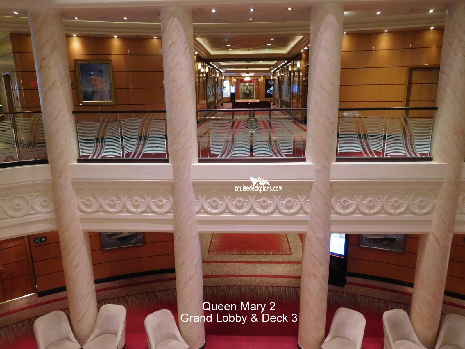 Queen Mary 2 Grand Lobby is located on Deck 3 (deck). We have provided the deck plan image for your reference.
