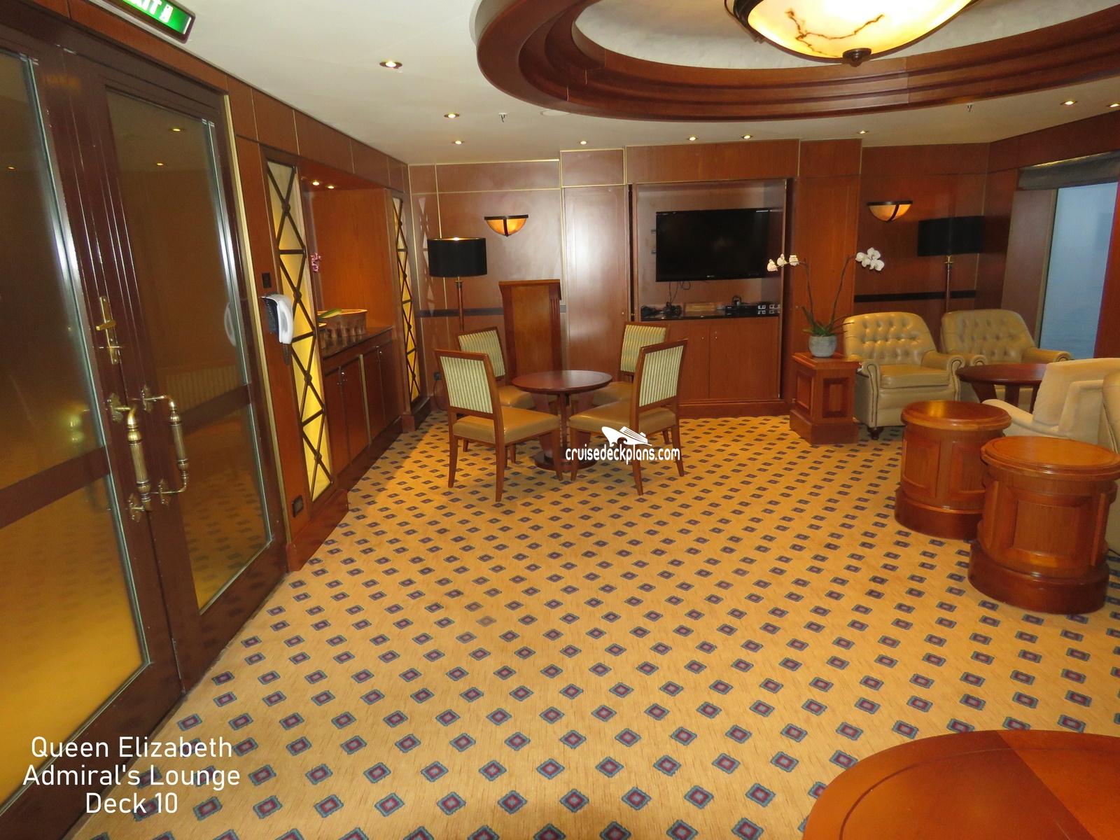 Queen Elizabeth Admirals Lounge is located on Deck 10 (deck). We have provided the deck plan image for your reference.