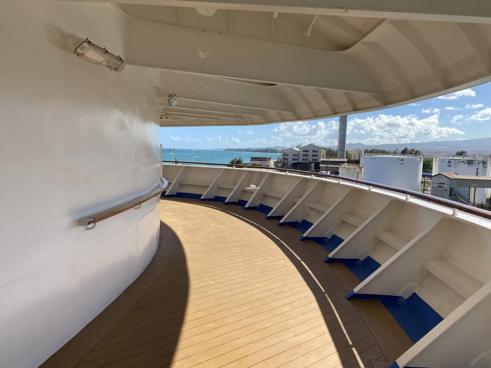 Outside promenade deck the circles the ship. It is narrow in places and the front part of the promenade goes up steep stairs to Emerald deck where you go out to the bow of the ship.