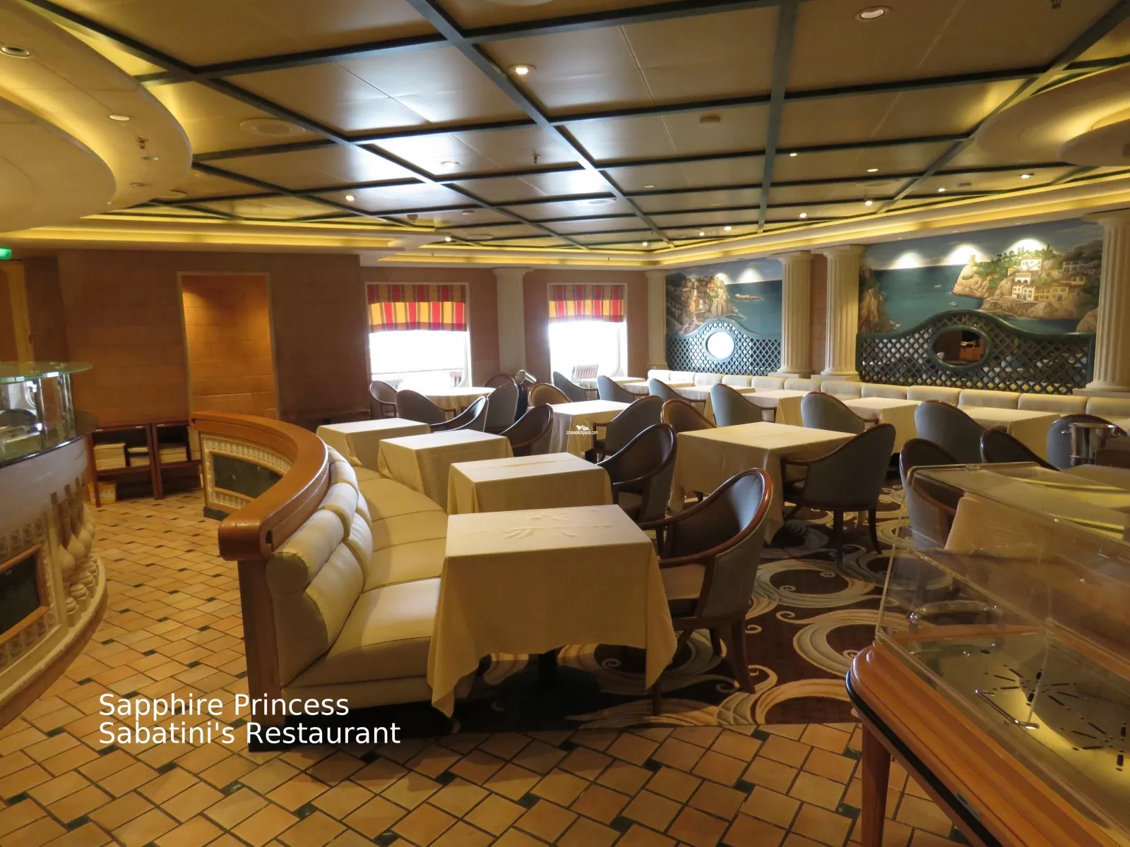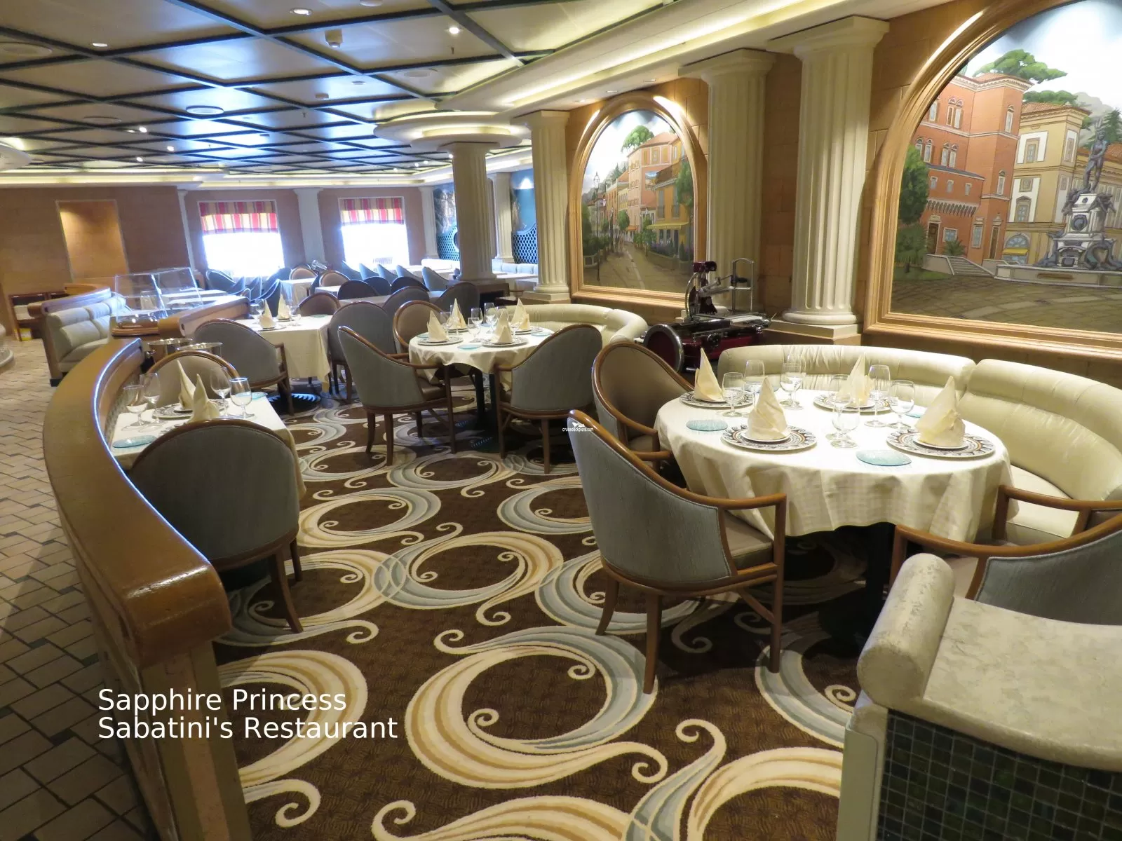 This page shows actual pictures for Sapphire Princess Sabatinis. Most of our pictures are contributed by actual cruisers. You will find that all the Sapphire Princess Sabatinis pictures on this page also posted directly onto our deck plans near the actual location the photo was taken. You can browse the pictures here or you can click on them as you are viewing the Sapphire Princess deck plans. For deck plan viewing click on the ship button above or scroll down to view the pictures on this page.