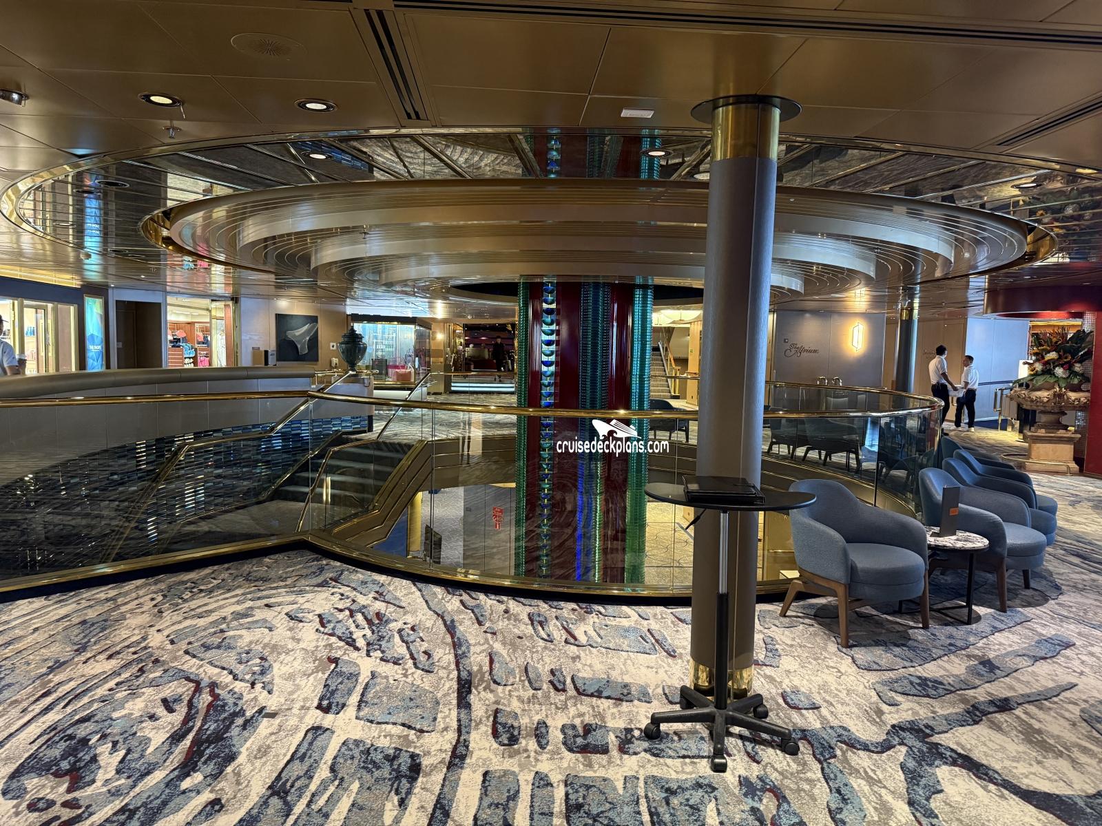 Ships atrium. On first level is seating area, hotel manager office and cruise director office.
