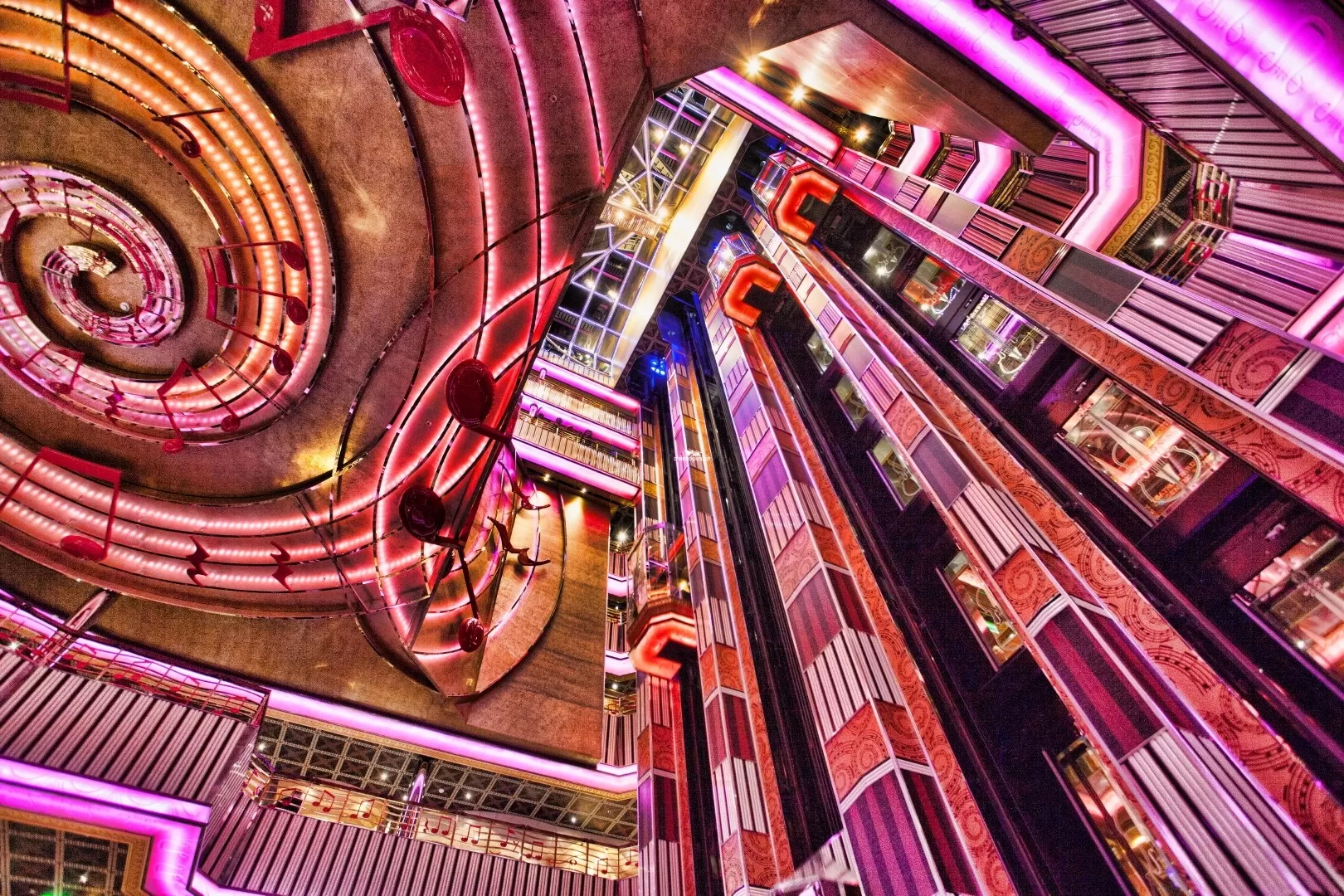 Ships atrium. On first level is bar, lounge area, customer services, and tour office.