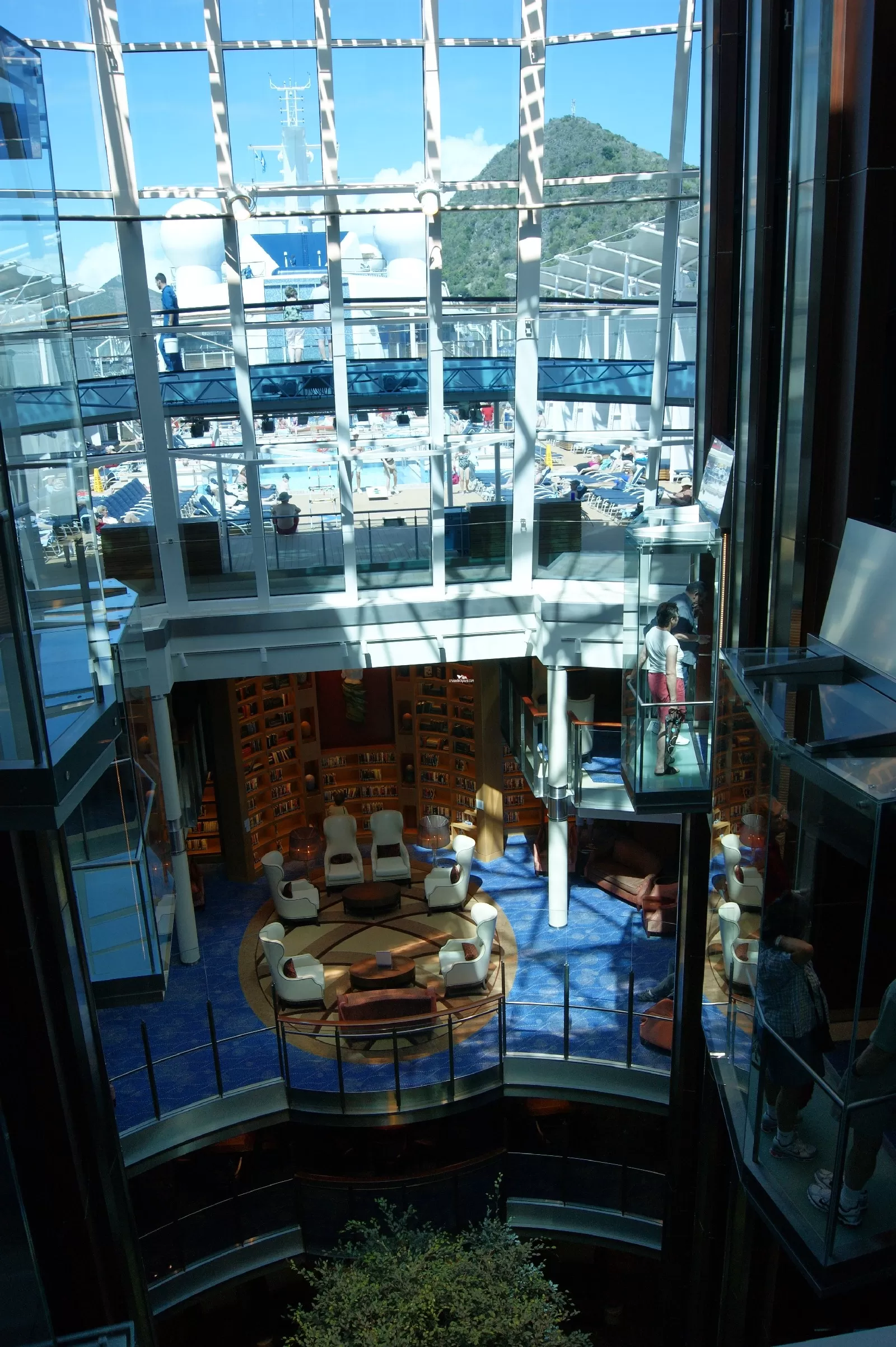 Atrium that spans mulitple decks. On first level you will find Passport Bar, Shore Excursions and Guest Relations with plenty of lounge chairs.