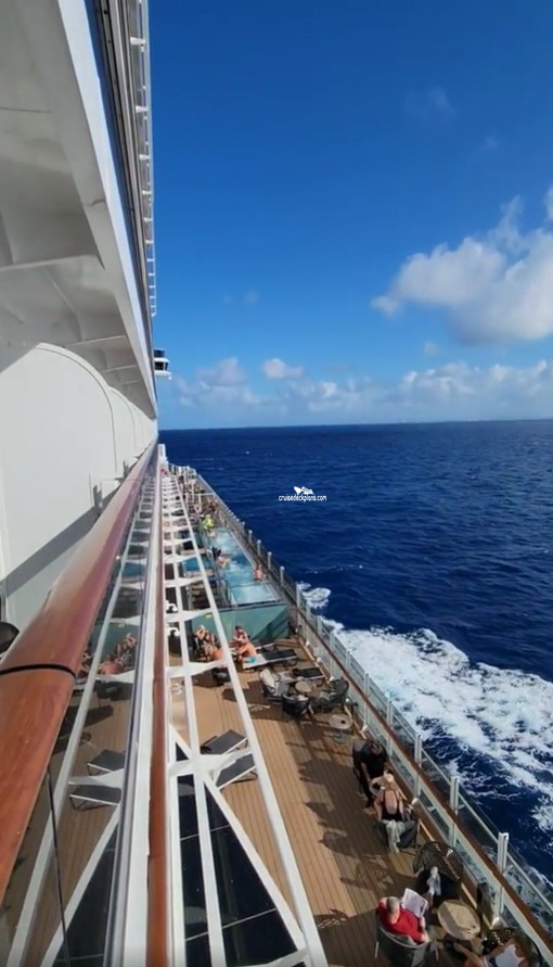 Deck 9 category B3 cabins on port and starboard side will have balcony partitions that do not extend all the way to the railing. This means that the area around the railing will have clear dividers (railing height) between balconies. You will be able to see your neighbors balcony.