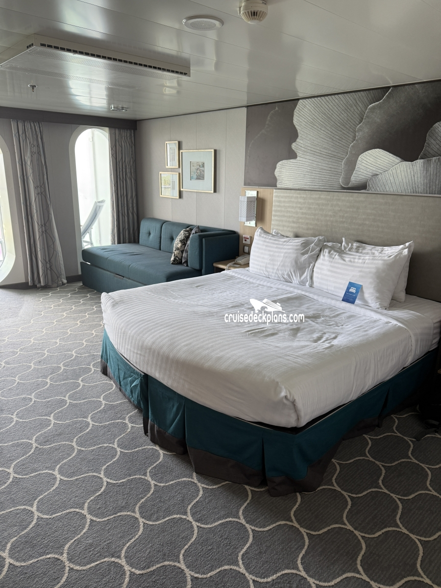 Some balconies up to 80 square feet. Category 1C (was D1) and 2C (was D2) has larger balconies. Some cabins are laid out with the bed near the balcony, others have the sofa near the balcony. Triple and Quad cabins have the sofa near the balcony. Layout changes every other cabin. Handicap cabins may have small chair bed instead of sofa bed. If there is more than two booked in cabin the chair bed is not recommended for adults.