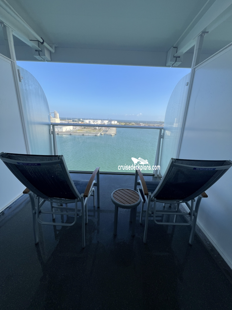 Some balconies up to 80 square feet. Category 1C (was D1) and 2C (was D2) has larger balconies. Some cabins are laid out with the bed near the balcony, others have the sofa near the balcony. Triple and Quad cabins have the sofa near the balcony. Layout changes every other cabin. Handicap cabins may have small chair bed instead of sofa bed. If there is more than two booked in cabin the chair bed is not recommended for adults.