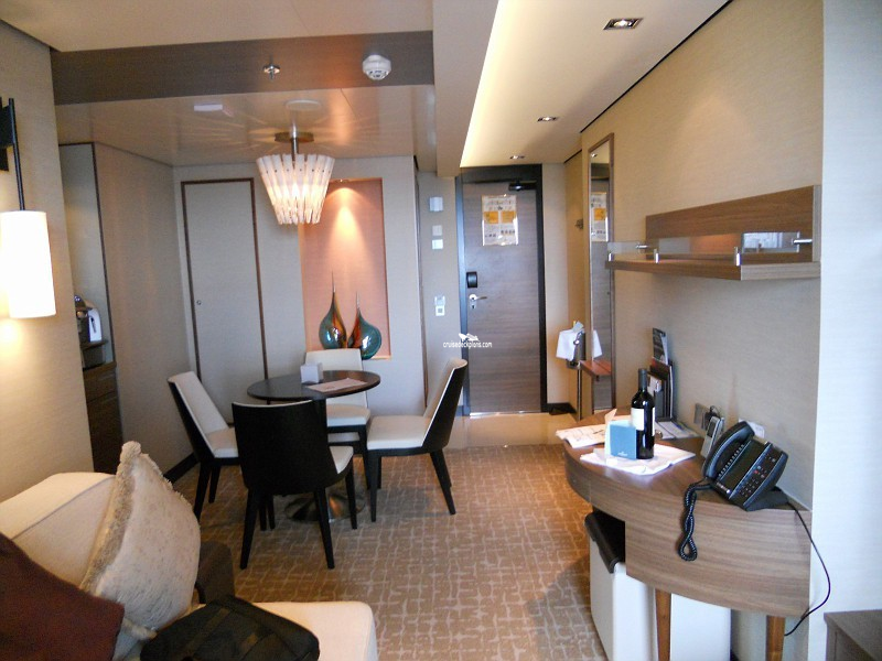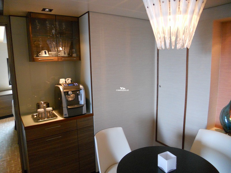 Butler Service / Concierge Service / Priority Check In / Priority Debarkation / Priority Tender Boarding / Dining in the Stateroom / Welcome Champagne / Exclusive Lounge / Exclusive Pool / Exclusive Outdoor Lounge / Thick Cotton Robes / Pillow Menu / Espresso & Cappuccino machine / Special suite menus / Bliss collection pillow-top mattress / Treats delivered to door every night / Courtyard valet / Escort to suite /