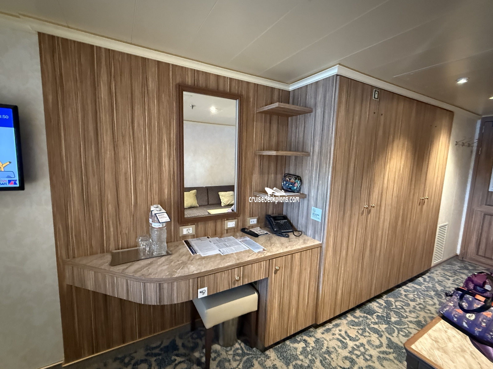 These are some actual stateroom pictures of cabin 1215 on the Carnival Firenze. Click on images below for larger image and slide show. The slide show will show the date the picture was uploaded to out website. This date is useful because Carnival Firenze typically will update its cabins every three to five years with new carpeting and decor. We will keep older pictures for you to compare the more recent photos to. The pictures are sorted by the newest ones first. Most of our cabin pictures are contributed by actual cruisers. We pay 50 cents for any that we use. You can upload your cabin photos HERE. Afer you are done looking at these photos and/or the videos below you can click here to select another cabin.
