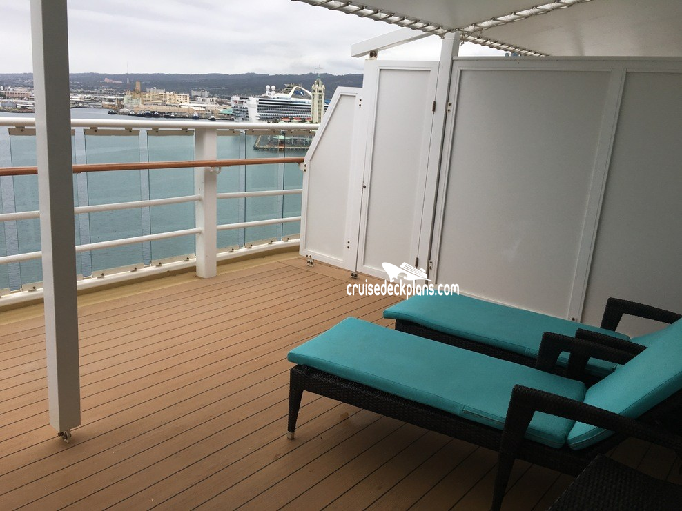 Category SE cabins are 394 to 410 square feet with additional188 square foot balcony. Category SF cabins are from 299 to 306 square feet with additional 188 to 306 square foot balcony. Category SD is 880 square feet.