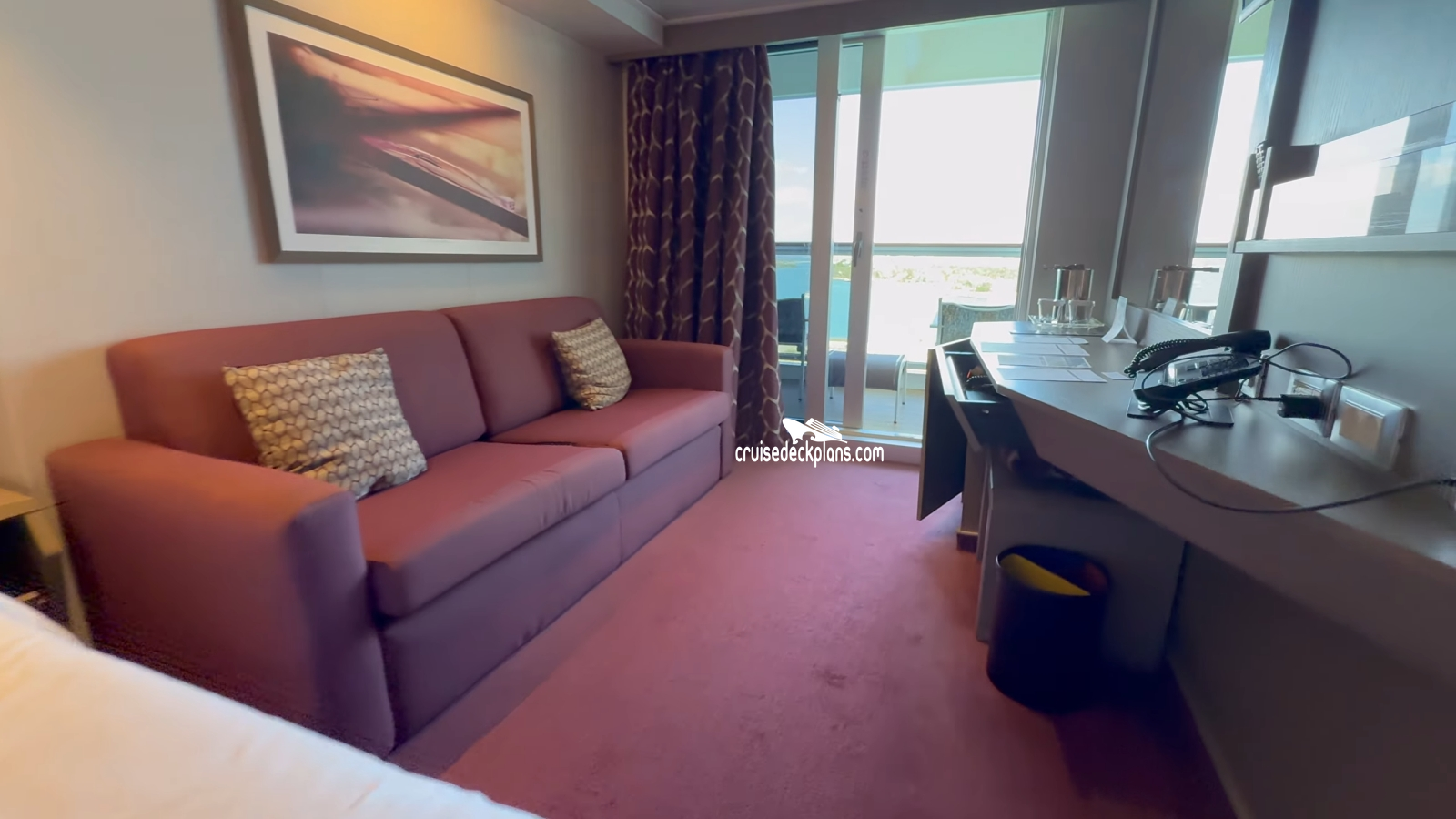 In some cabins the bed will be close to the balcony door. In other cabins the couch will be close to the balcony door.