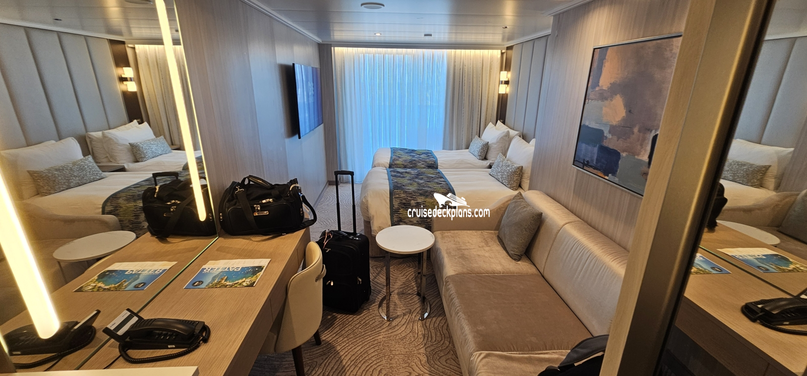 - Some cabins have bed close to the balcony, others have sofa close to the balcony.