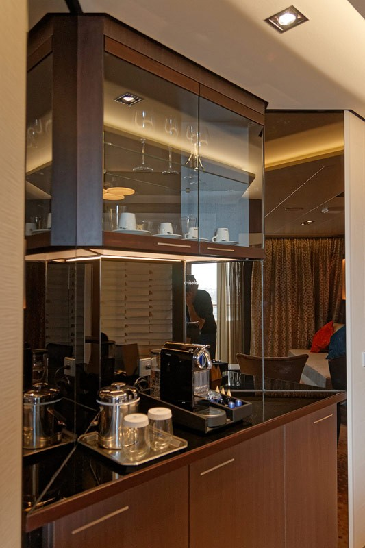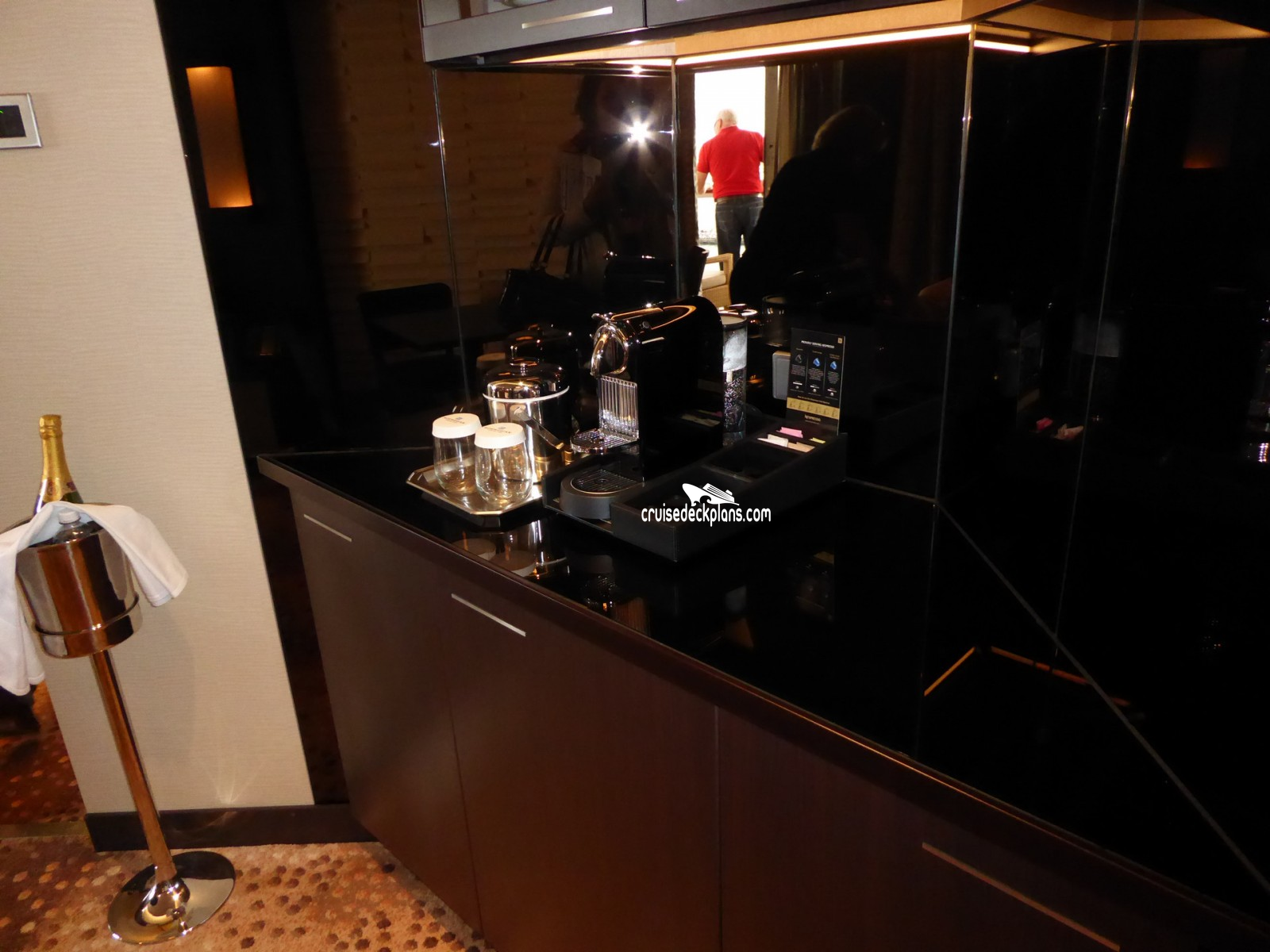 Butler Service / Concierge Service / Priority Check In / Priority Debarkation / Priority Tender Boarding / Dining in the Stateroom / Welcome Champagne / Exclusive Lounge / Exclusive Pool / Exclusive Outdoor Lounge / Thick Cotton Robes / Pillow Menu / Espresso & Cappuccino machine / Special suite menus / Bliss collection pillow-top mattress / Treats delivered to door every night / Courtyard valet / Escort to suite /