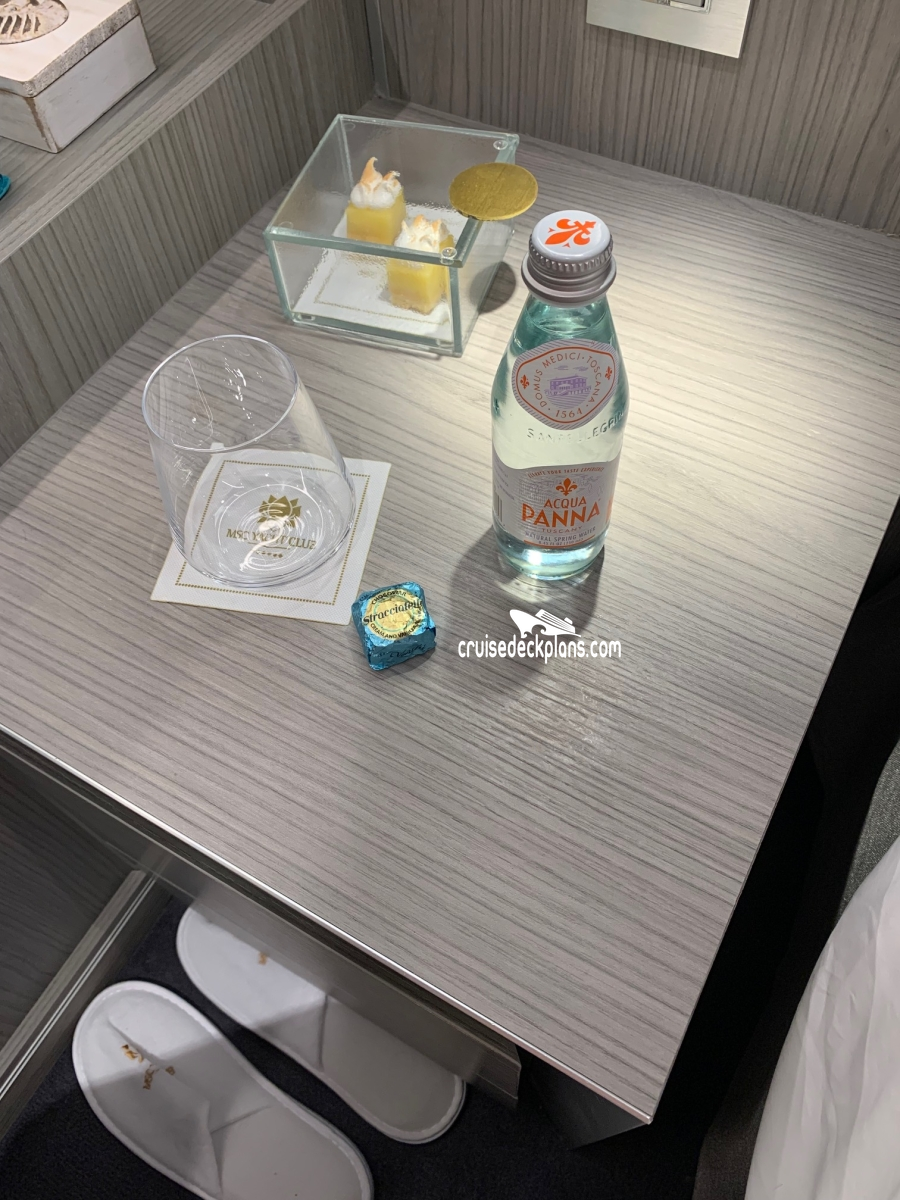 Butler Service / Concierge Service / Priority Check In / Priority Luggage Delivery / Priority Debarkation / Priority Tender Boarding / Exclusive Lounge / Exclusive Dinner Restaurant / Priority Dining Reservations / Exclusive Pool / Exclusive Outdoor Lounge / Pillow Menu / 24-hour room service / Welcome package (Prosecco and chocolate box) / Access to Top Exclusive Solarium / Bathrobe and slippers in cabin / Access to Thermal area / 40% off dedicated Spa prepaid package / 10% off Spa treatments purchased on board / Premium Extra Drink Package / Premium Internet Package / Luggage packing/unpacking / Newspaper delivery upon request / MSC for ME wristband / Gourmet restaurant for breakfast, lunch and dinner / Panoramic Top Sail Lounge with bar /