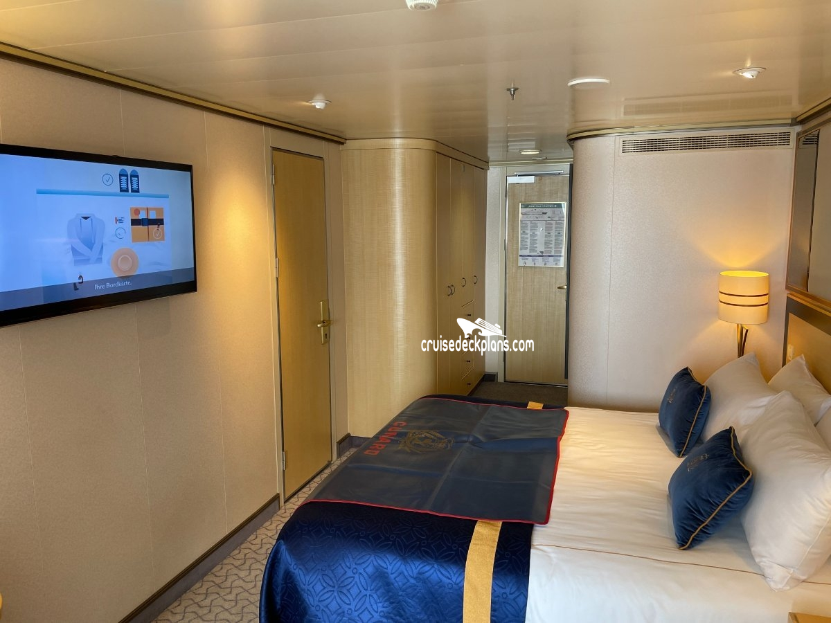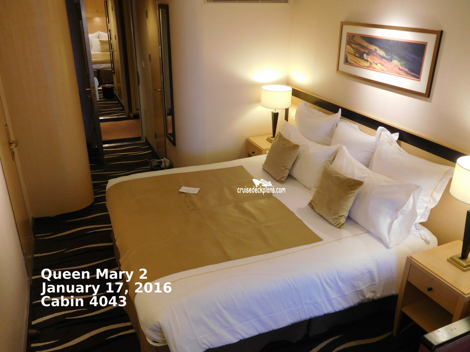 These are some actual stateroom pictures of cabin 4043 on the Queen Mary 2. Click on images below for larger image and slide show. The slide show will show the date the picture was uploaded to out website. This date is useful because Queen Mary 2 typically will update its cabins every three to five years with new carpeting and decor. We will keep older pictures for you to compare the more recent photos to. The pictures are sorted by the newest ones first. Most of our cabin pictures are contributed by actual cruisers. We pay 50 cents for any that we use. You can upload your cabin photos HERE. Afer you are done looking at these photos and/or the videos below you can click here to select another cabin.