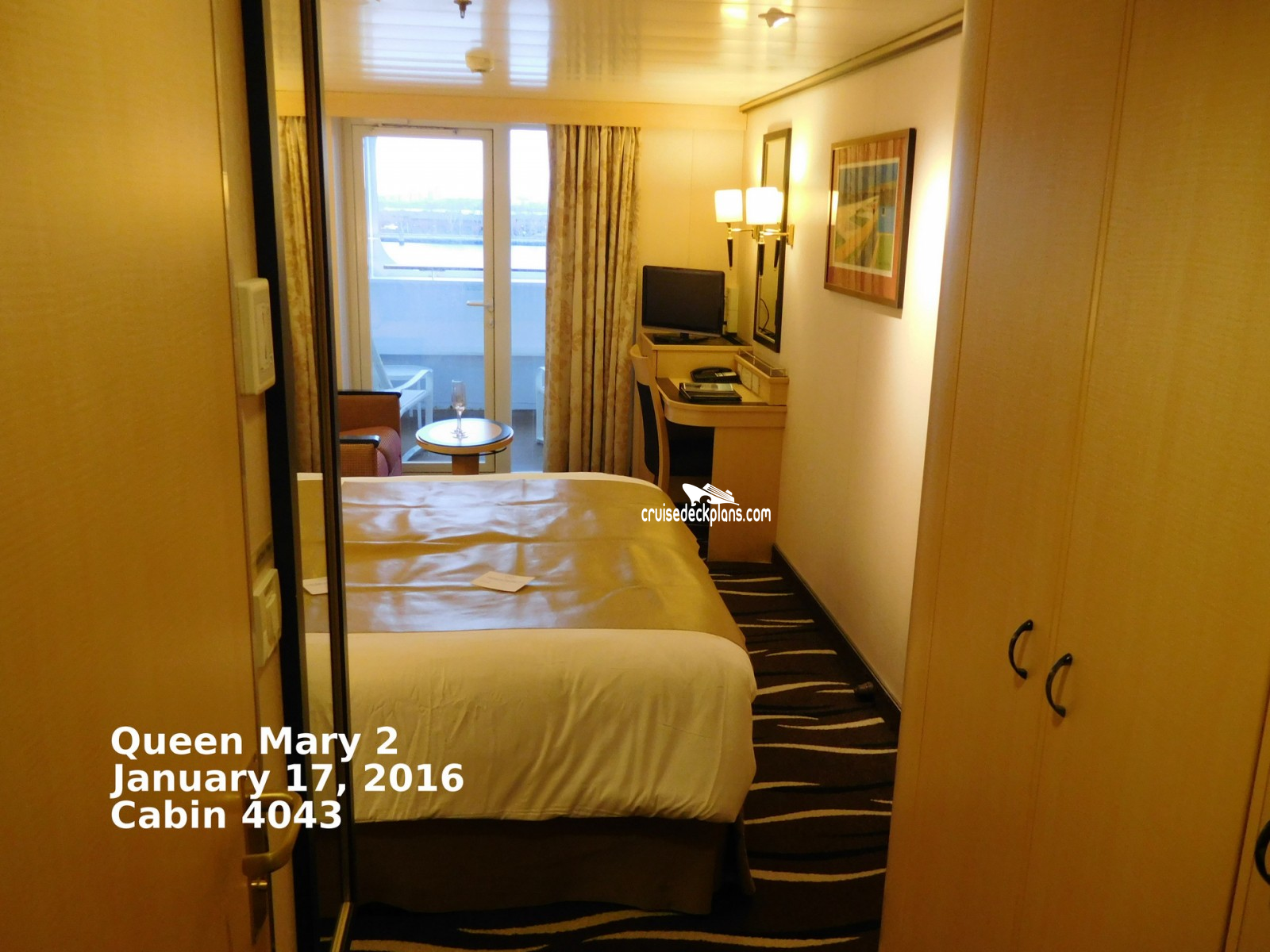 Queen Mary 2 Sheltered Balcony cabin number 4043 ACTUAL videos and/or pictures, floor plans, diagrams and detailed features including a deck image of the actual location on the Queen Mary 2 ship for cabin 4043. Cruisedeckplans.com has 75,595 different (staterooms) cabins that have actual cabin pictures and/or cabin videos taken by real cruisers. That is plenty of coverage to provide you with a good sampling of all the different cabins on cruise ships. Take a minute and notice the breadcrumb menu above. This is a quick easy way to navigate our website. You can also use the menu above for menu items specific to the Queen Mary 2 cruise ship.