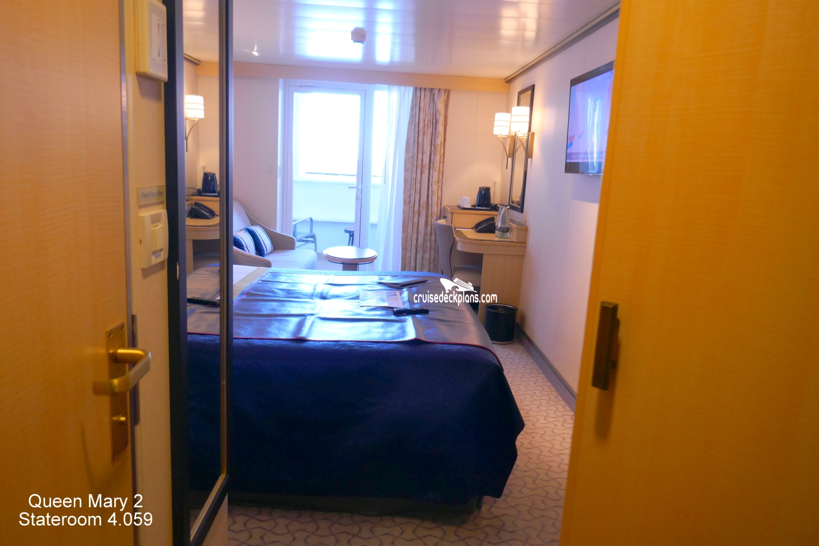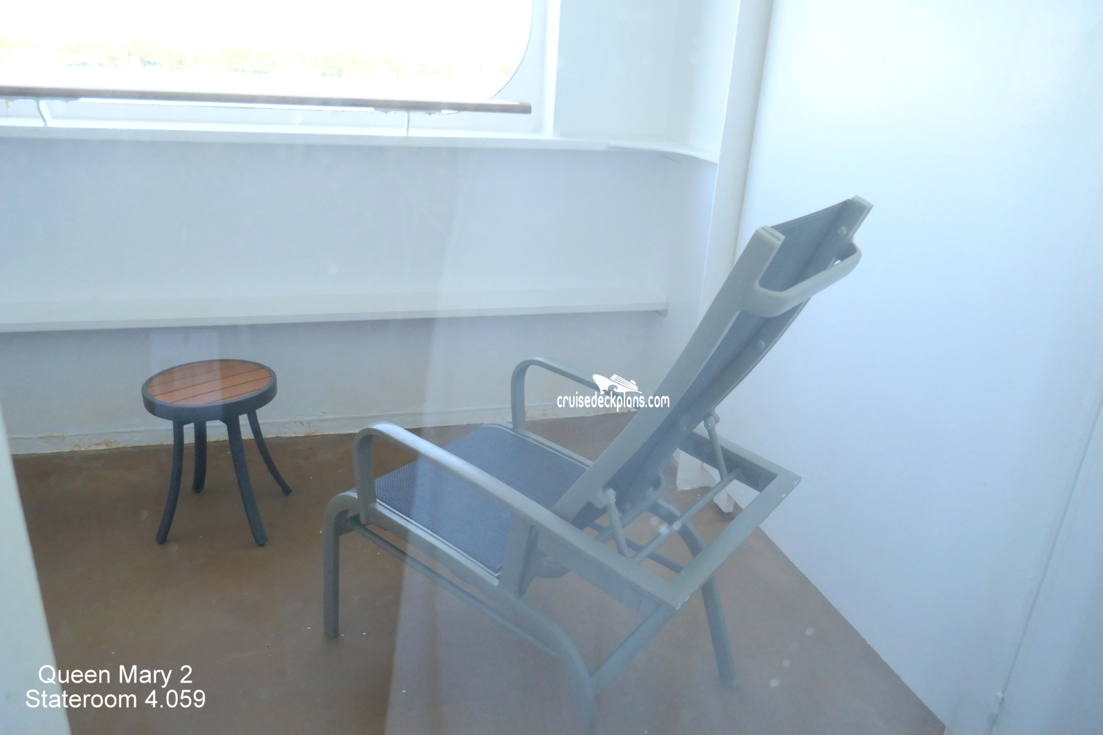 Queen Mary 2 Sheltered Balcony cabin number 4059 ACTUAL videos and/or pictures, floor plans, diagrams and detailed features including a deck image of the actual location on the Queen Mary 2 ship for cabin 4059. Cruisedeckplans.com has 74,573 different (staterooms) cabins that have actual cabin pictures and/or cabin videos taken by real cruisers. That is plenty of coverage to provide you with a good sampling of all the different cabins on cruise ships. Take a minute and notice the breadcrumb menu above. This is a quick easy way to navigate our website. You can also use the menu above for menu items specific to the Queen Mary 2 cruise ship.