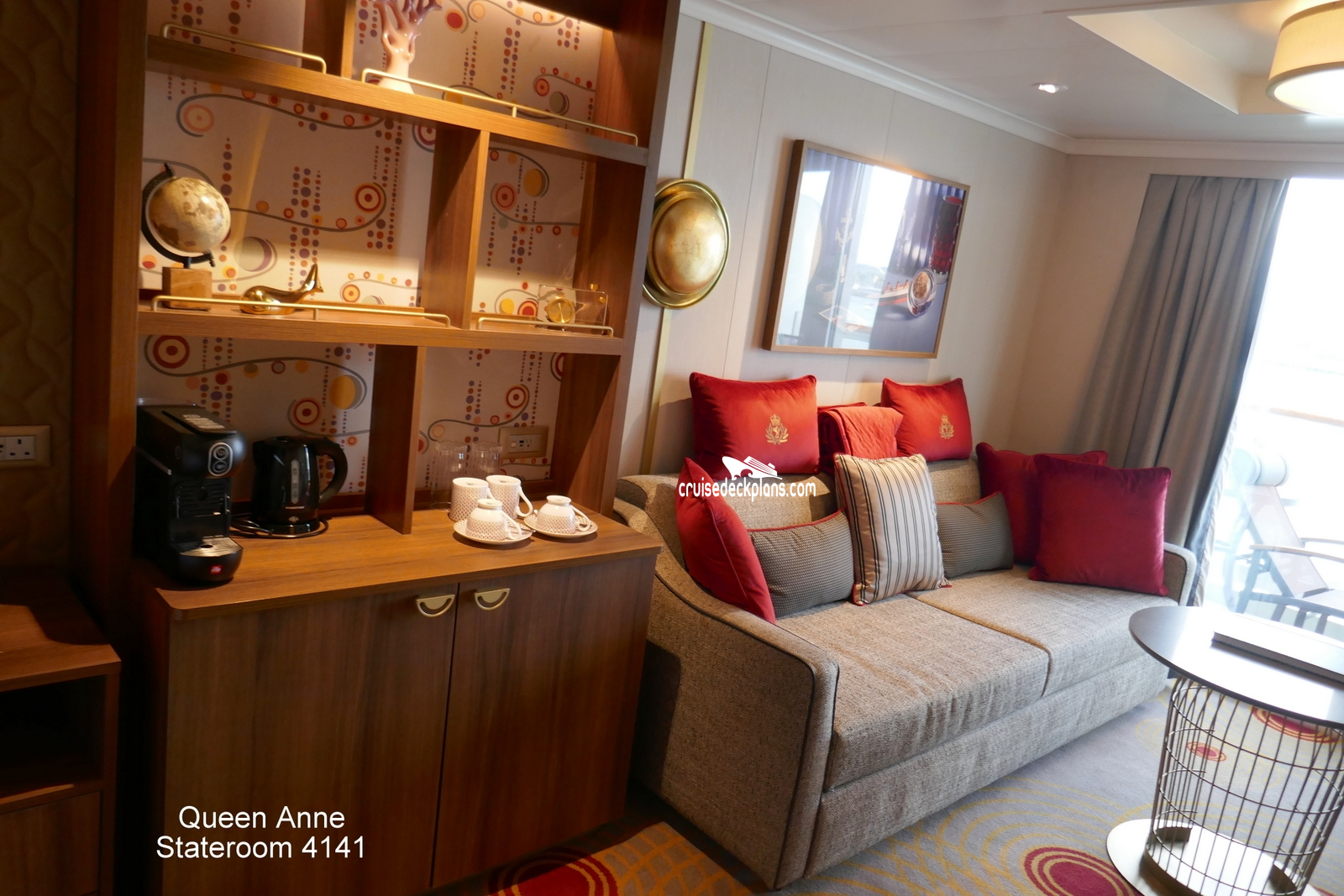 Queen Anne Princess Suite cabin number 4141 ACTUAL videos and/or pictures, floor plans, diagrams and detailed features including a deck image of the actual location on the Queen Anne ship for cabin 4141. Cruisedeckplans.com has 75,392 different (staterooms) cabins that have actual cabin pictures and/or cabin videos taken by real cruisers. That is plenty of coverage to provide you with a good sampling of all the different cabins on cruise ships. Take a minute and notice the breadcrumb menu above. This is a quick easy way to navigate our website. You can also use the menu above for menu items specific to the Queen Anne cruise ship.