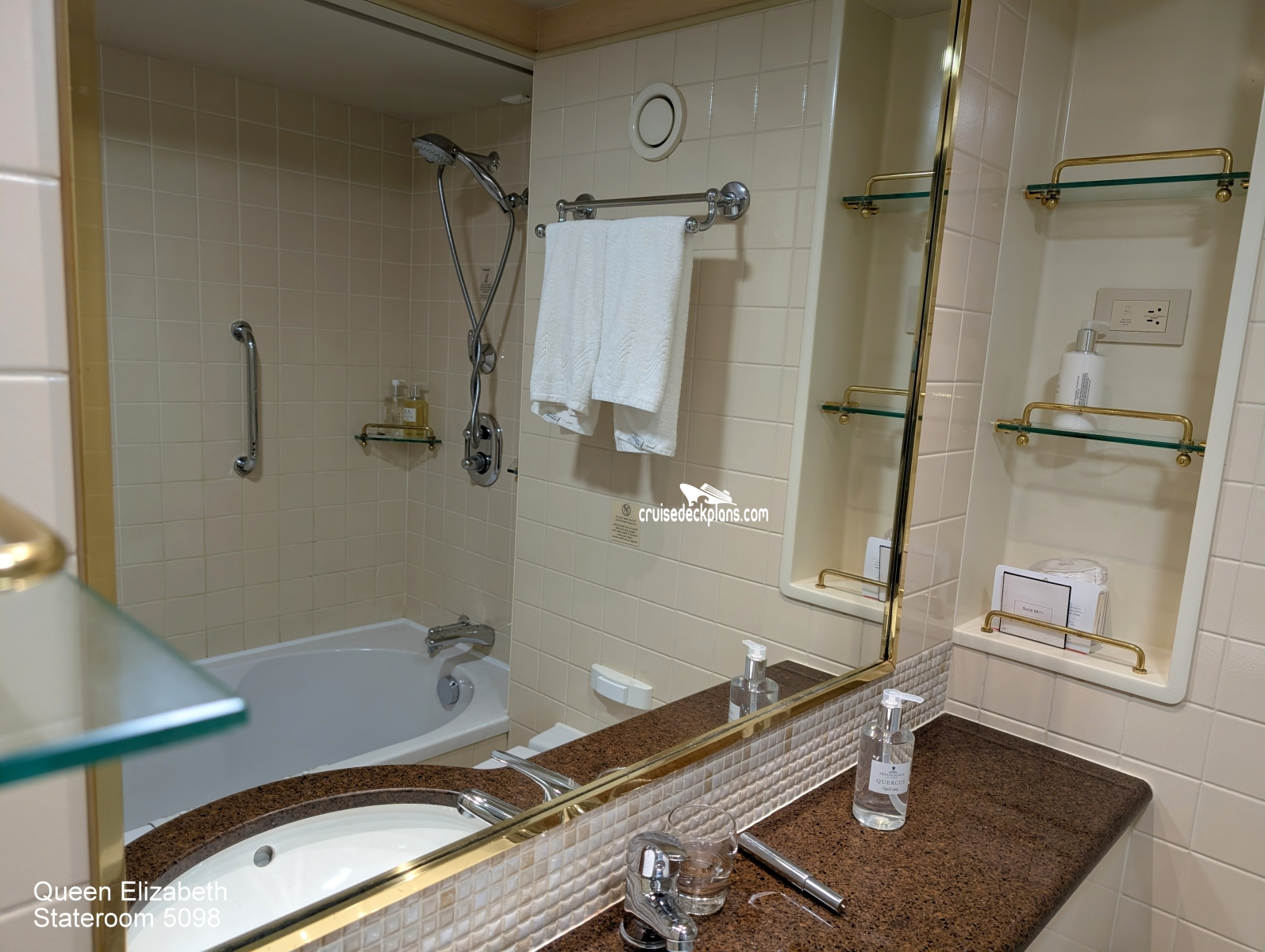 Queen Elizabeth Princess Suite cabin number 5098 ACTUAL videos and/or pictures, floor plans, diagrams and detailed features including a deck image of the actual location on the Queen Elizabeth ship for cabin 5098. Cruisedeckplans.com has 74,773 different (staterooms) cabins that have actual cabin pictures and/or cabin videos taken by real cruisers. That is plenty of coverage to provide you with a good sampling of all the different cabins on cruise ships. Take a minute and notice the breadcrumb menu above. This is a quick easy way to navigate our website. You can also use the menu above for menu items specific to the Queen Elizabeth cruise ship.