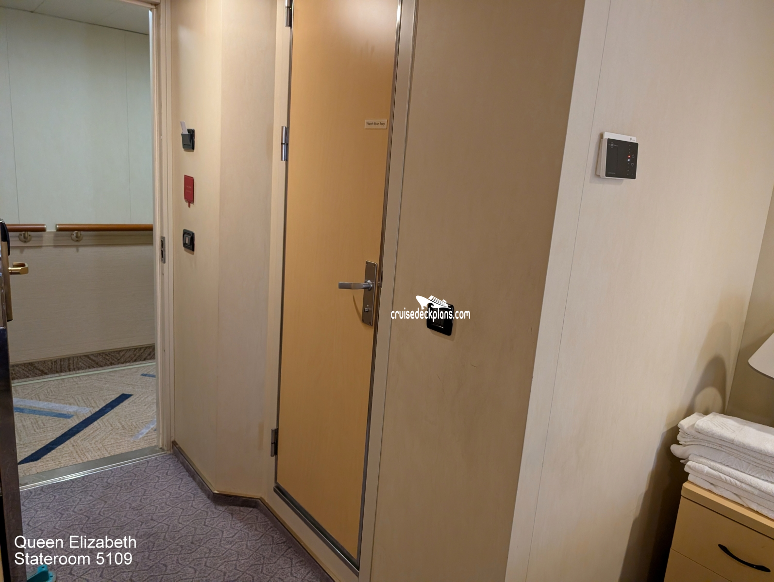 These are some actual stateroom pictures of cabin 5109 on the Queen Elizabeth. Click on images below for larger image and slide show. The slide show will show the date the picture was uploaded to out website. This date is useful because Queen Elizabeth typically will update its cabins every three to five years with new carpeting and decor. We will keep older pictures for you to compare the more recent photos to. The pictures are sorted by the newest ones first. Most of our cabin pictures are contributed by actual cruisers. We pay 50 cents for any that we use. You can upload your cabin photos HERE. Afer you are done looking at these photos and/or the videos below you can click here to select another cabin.