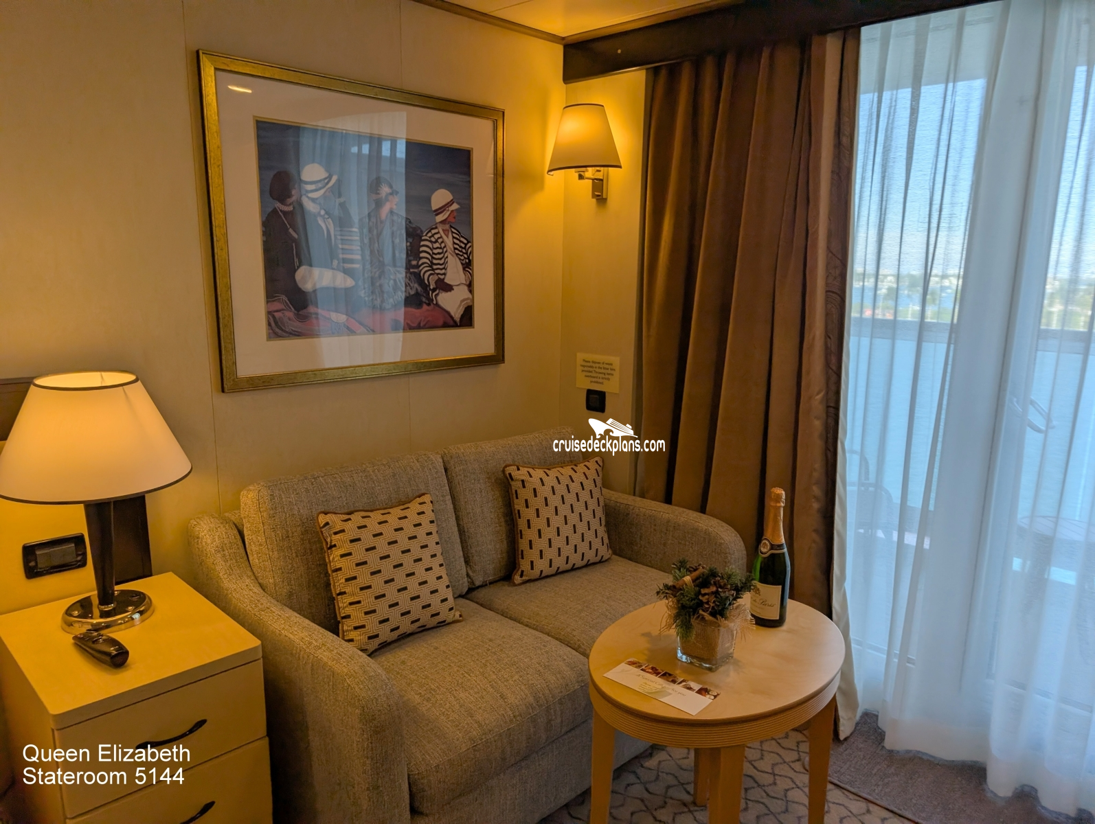 Queen Elizabeth Balcony cabin number 5144 ACTUAL videos and/or pictures, floor plans, diagrams and detailed features including a deck image of the actual location on the Queen Elizabeth ship for cabin 5144. Cruisedeckplans.com has 74,822 different (staterooms) cabins that have actual cabin pictures and/or cabin videos taken by real cruisers. That is plenty of coverage to provide you with a good sampling of all the different cabins on cruise ships. Take a minute and notice the breadcrumb menu above. This is a quick easy way to navigate our website. You can also use the menu above for menu items specific to the Queen Elizabeth cruise ship.
