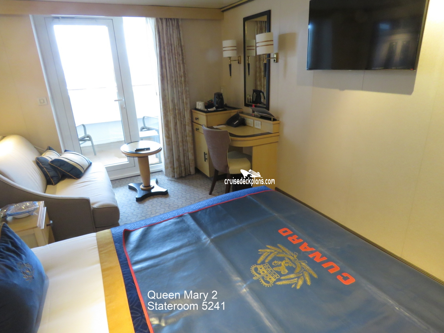 Queen Mary 2 Sheltered Balcony cabin number 5241 ACTUAL videos and/or pictures, floor plans, diagrams and detailed features including a deck image of the actual location on the Queen Mary 2 ship for cabin 5241. Cruisedeckplans.com has 75,589 different (staterooms) cabins that have actual cabin pictures and/or cabin videos taken by real cruisers. That is plenty of coverage to provide you with a good sampling of all the different cabins on cruise ships. Take a minute and notice the breadcrumb menu above. This is a quick easy way to navigate our website. You can also use the menu above for menu items specific to the Queen Mary 2 cruise ship.