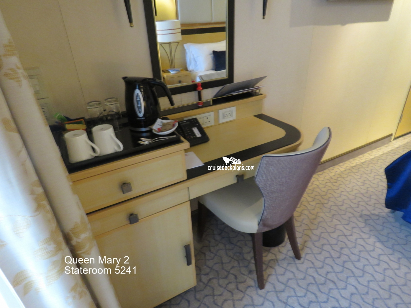These are some actual stateroom pictures of cabin 5241 on the Queen Mary 2. Click on images below for larger image and slide show. The slide show will show the date the picture was uploaded to out website. This date is useful because Queen Mary 2 typically will update its cabins every three to five years with new carpeting and decor. We will keep older pictures for you to compare the more recent photos to. The pictures are sorted by the newest ones first. Most of our cabin pictures are contributed by actual cruisers. We pay 50 cents for any that we use. You can upload your cabin photos HERE. Afer you are done looking at these photos and/or the videos below you can click here to select another cabin.