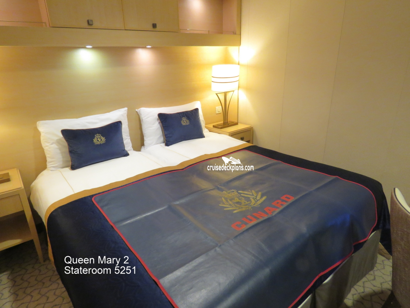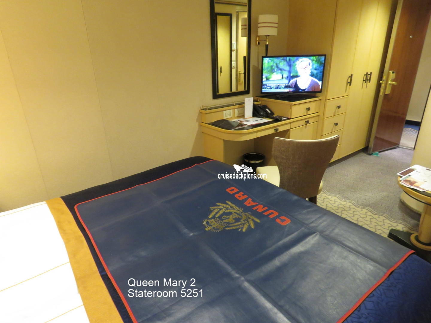 Queen Mary 2 Inside cabin number 5251 ACTUAL videos and/or pictures, floor plans, diagrams and detailed features including a deck image of the actual location on the Queen Mary 2 ship for cabin 5251. Cruisedeckplans.com has 75,091 different (staterooms) cabins that have actual cabin pictures and/or cabin videos taken by real cruisers. That is plenty of coverage to provide you with a good sampling of all the different cabins on cruise ships. Take a minute and notice the breadcrumb menu above. This is a quick easy way to navigate our website. You can also use the menu above for menu items specific to the Queen Mary 2 cruise ship.