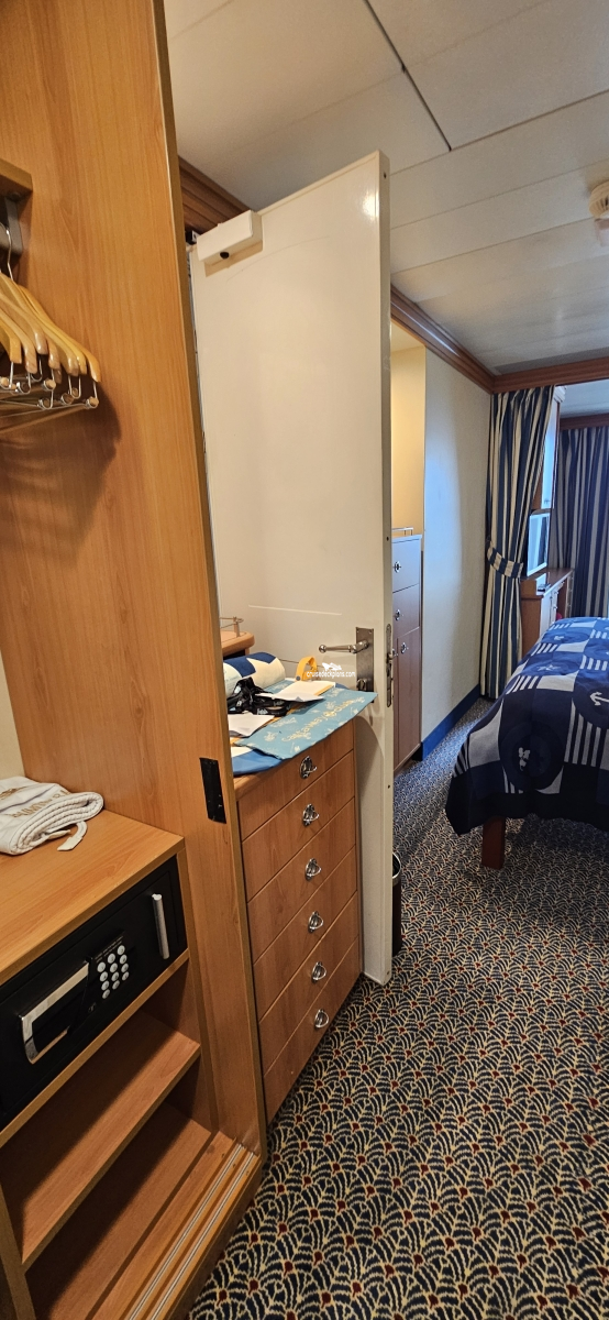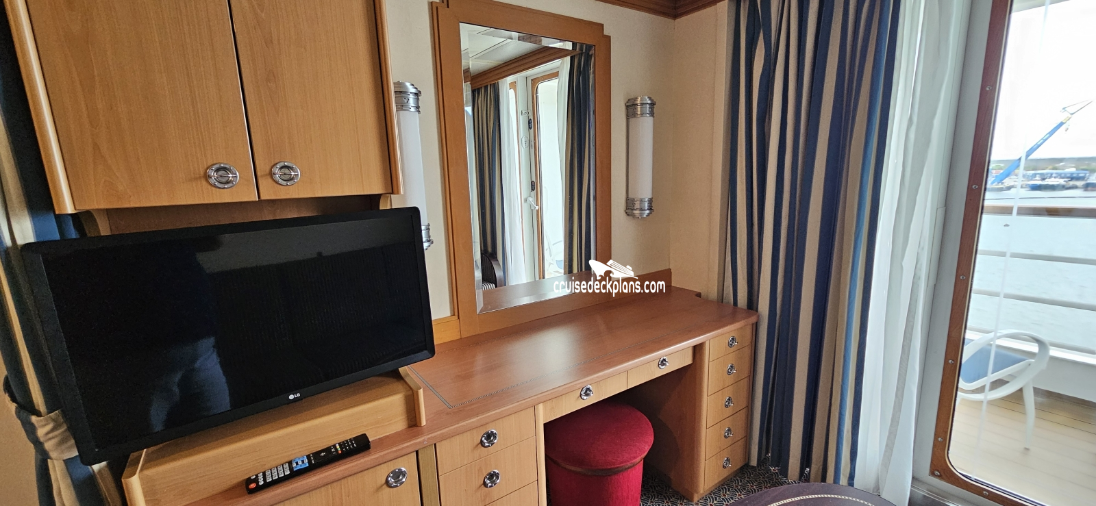 All staterooms have tub & shower, remote-control color TV, closet safe, in-room safe, hair dryer, phone with voice-mail messaging, and individual climate control.