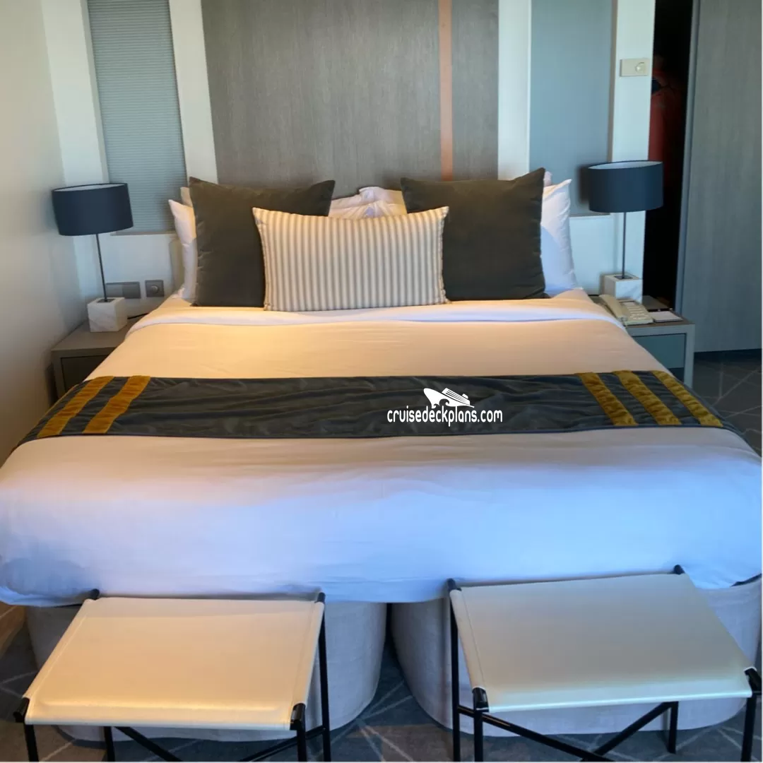 Butler Service / Priority Check In / Priority Debarkation / Priority Tender Boarding / Dining in the Stateroom / Afternoon Canapes / Afternoon Tea / Welcome Champagne / Exclusive Lounge / Exclusive Dinner Restaurant / Thick Cotton Robes / Pillow Menu / Access to Michael's Club (complimentary cocktails, appetizers, and a dedicated Concierge.) / Reserved theatre seating on Evening Chic nights / Main & specialty restaurant seating preferences / Custom premium mattress / Complimentary daily in-suite espresso and cappuccino / Luxury bath amenities / Oversized 100% cotton bath towels / Hansgrohe showerhead / Bottled water on Embarkation / Day Daily Delectables rotation of savory and sweet snacks. /