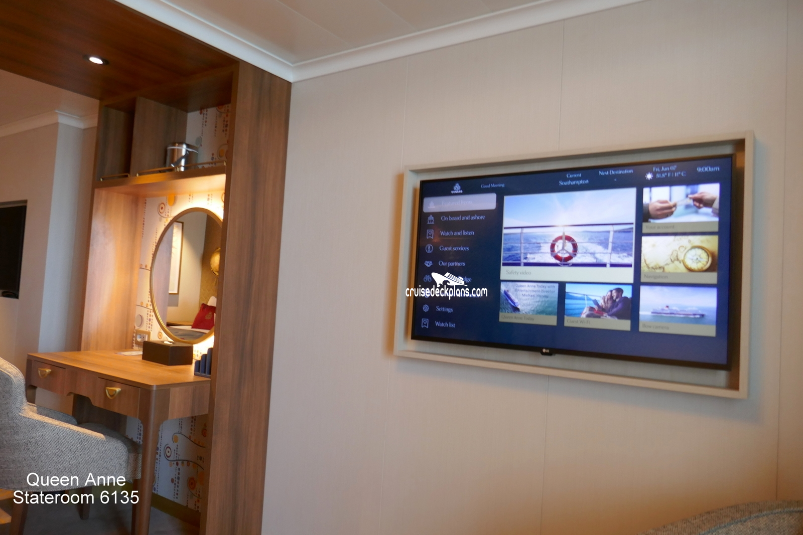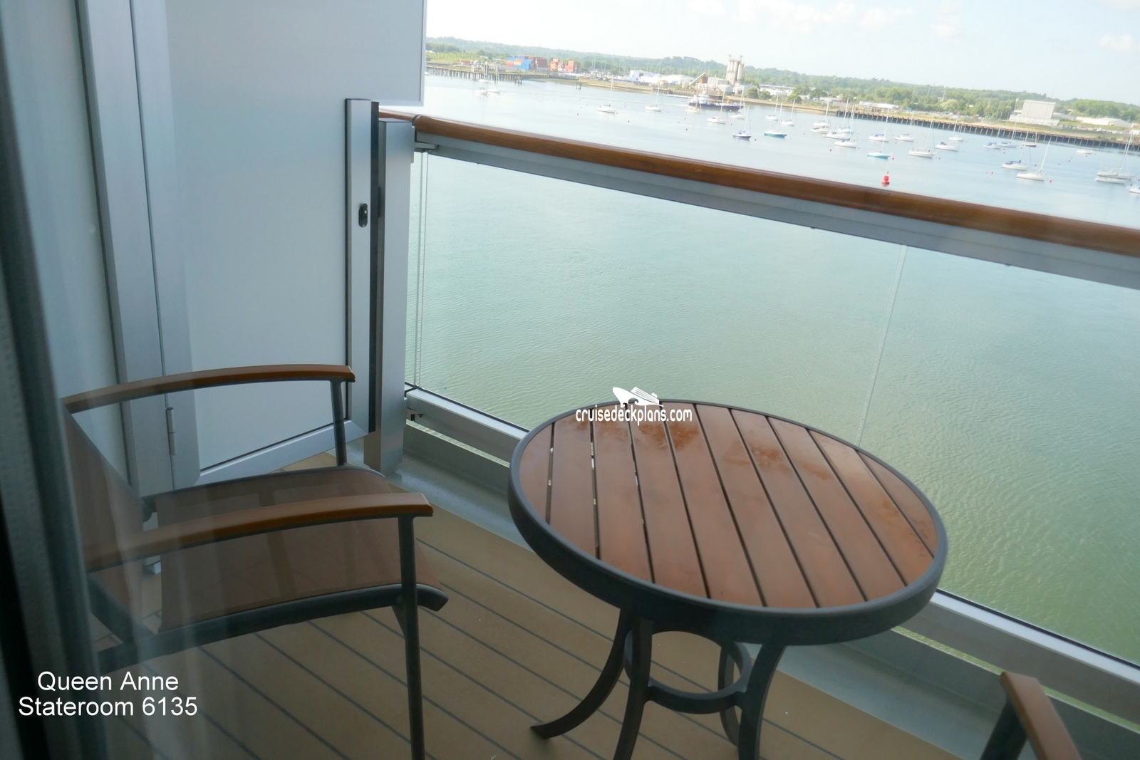 Queen Anne Princess Suite cabin number 6135 ACTUAL videos and/or pictures, floor plans, diagrams and detailed features including a deck image of the actual location on the Queen Anne ship for cabin 6135. Cruisedeckplans.com has 75,885 different (staterooms) cabins that have actual cabin pictures and/or cabin videos taken by real cruisers. That is plenty of coverage to provide you with a good sampling of all the different cabins on cruise ships. Take a minute and notice the breadcrumb menu above. This is a quick easy way to navigate our website. You can also use the menu above for menu items specific to the Queen Anne cruise ship.
