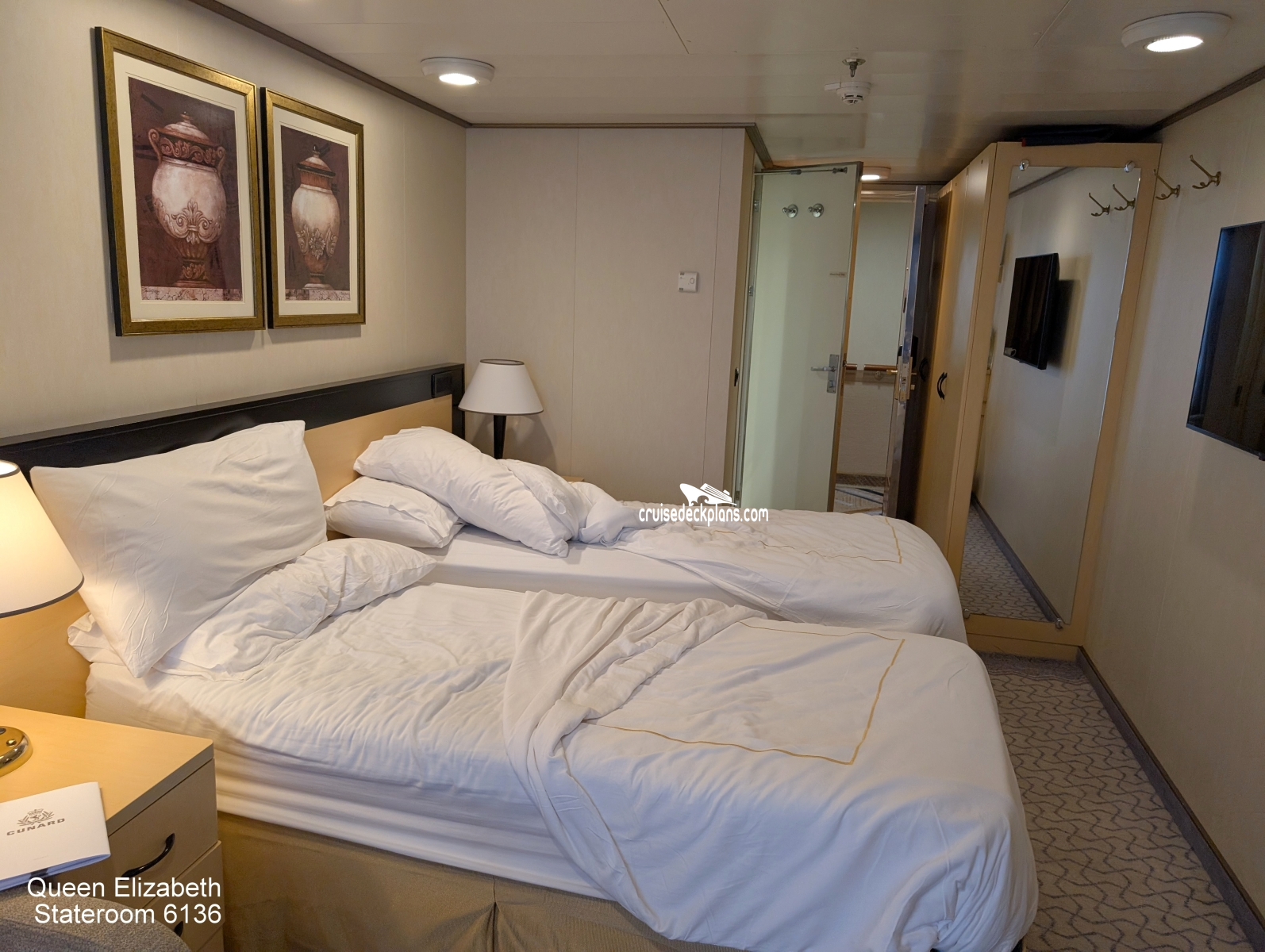 Scroll over cabin (stateroom) tiles below to click and watch actual stateroom videos of Queen Elizabeth cabin 6136. You can choose to watch the videos right on this page, or click to watch them on YouTube (will open in new window). When you are done viewing these videos and/or the cabin pictures above, you can click here to select another cabin. The date shown below is the date video was published. Use this to see decor changes. Keep in mind that stateroom cabins are typically updated once every three to five years. To save you time, Cruisedeckplans.com will spend hours every week finding more actual stateroom videos on YouTube.