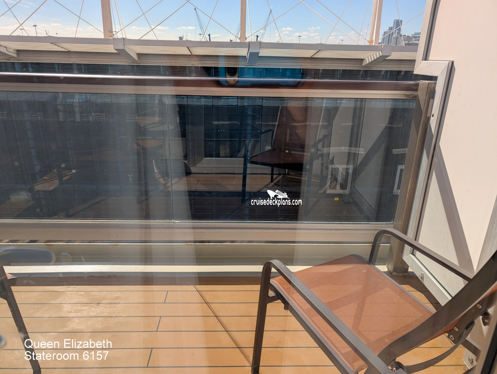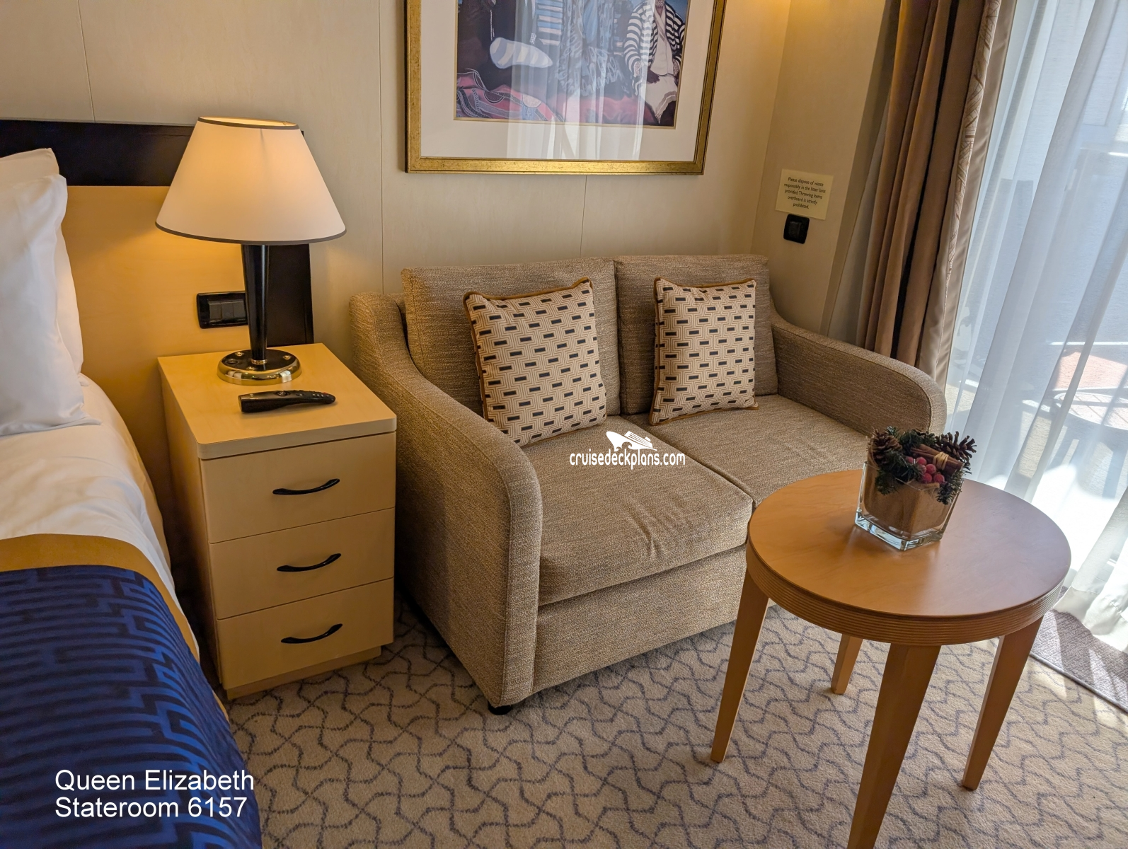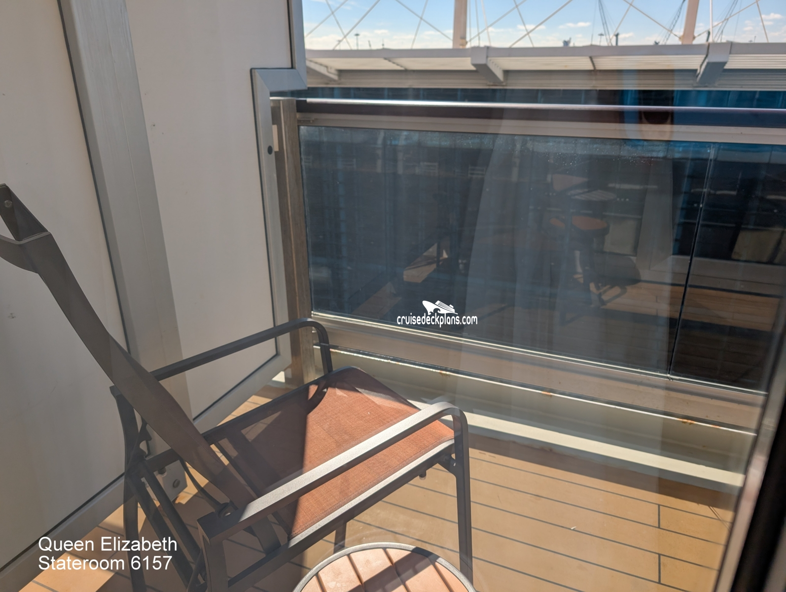 Queen Elizabeth Balcony cabin number 6157 ACTUAL videos and/or pictures, floor plans, diagrams and detailed features including a deck image of the actual location on the Queen Elizabeth ship for cabin 6157. Cruisedeckplans.com has 75,454 different (staterooms) cabins that have actual cabin pictures and/or cabin videos taken by real cruisers. That is plenty of coverage to provide you with a good sampling of all the different cabins on cruise ships. Take a minute and notice the breadcrumb menu above. This is a quick easy way to navigate our website. You can also use the menu above for menu items specific to the Queen Elizabeth cruise ship.