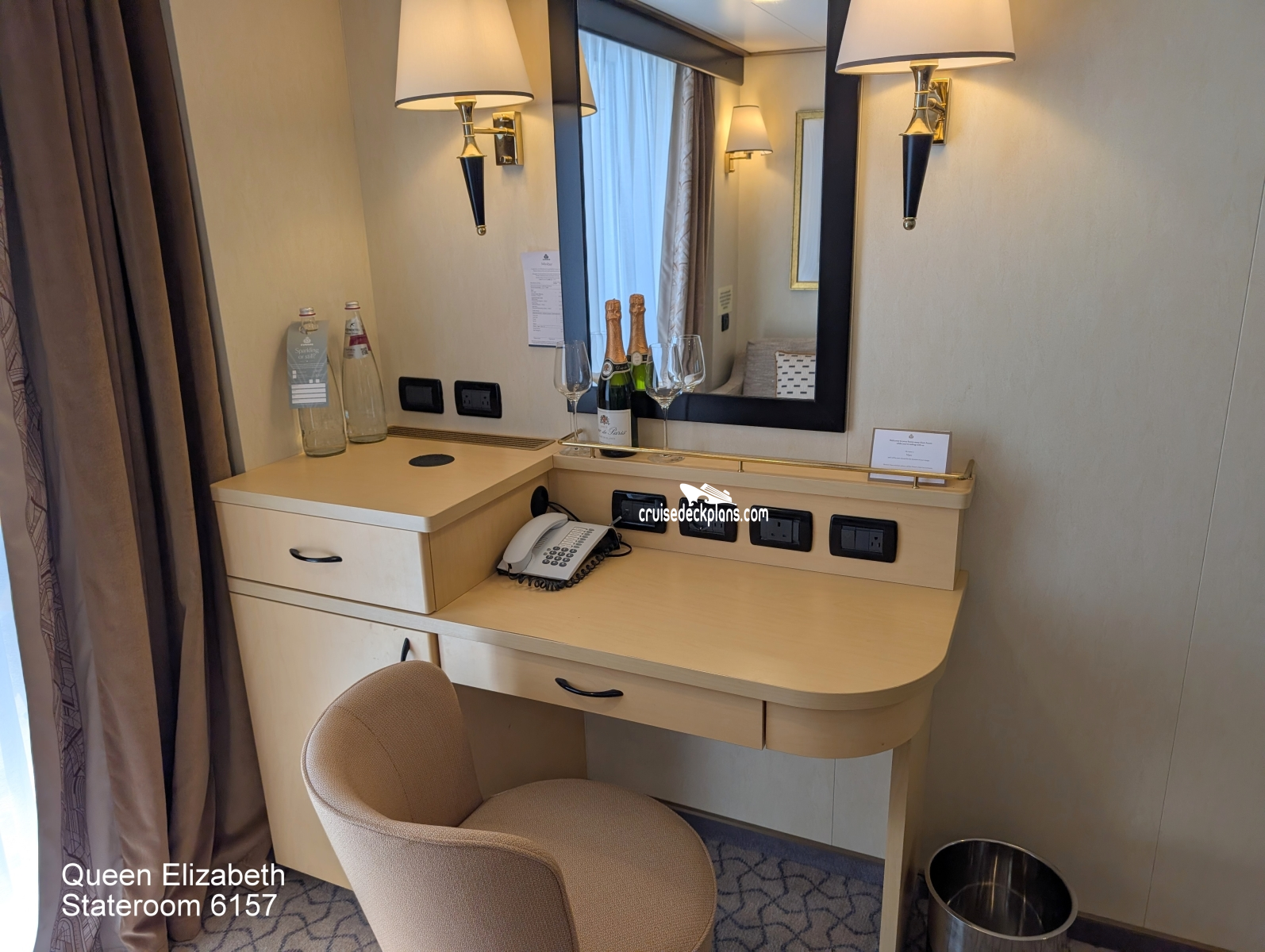 These are some actual stateroom pictures of cabin 6157 on the Queen Elizabeth. Click on images below for larger image and slide show. The slide show will show the date the picture was uploaded to out website. This date is useful because Queen Elizabeth typically will update its cabins every three to five years with new carpeting and decor. We will keep older pictures for you to compare the more recent photos to. The pictures are sorted by the newest ones first. Most of our cabin pictures are contributed by actual cruisers. We pay 50 cents for any that we use. You can upload your cabin photos HERE. Afer you are done looking at these photos and/or the videos below you can click here to select another cabin.