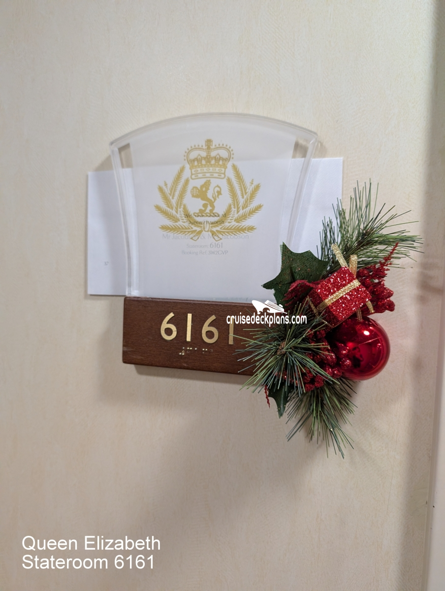 These are some actual stateroom pictures of cabin 6161 on the Queen Elizabeth. Click on images below for larger image and slide show. The slide show will show the date the picture was uploaded to out website. This date is useful because Queen Elizabeth typically will update its cabins every three to five years with new carpeting and decor. We will keep older pictures for you to compare the more recent photos to. The pictures are sorted by the newest ones first. Most of our cabin pictures are contributed by actual cruisers. We pay 50 cents for any that we use. You can upload your cabin photos HERE. Afer you are done looking at these photos and/or the videos below you can click here to select another cabin.
