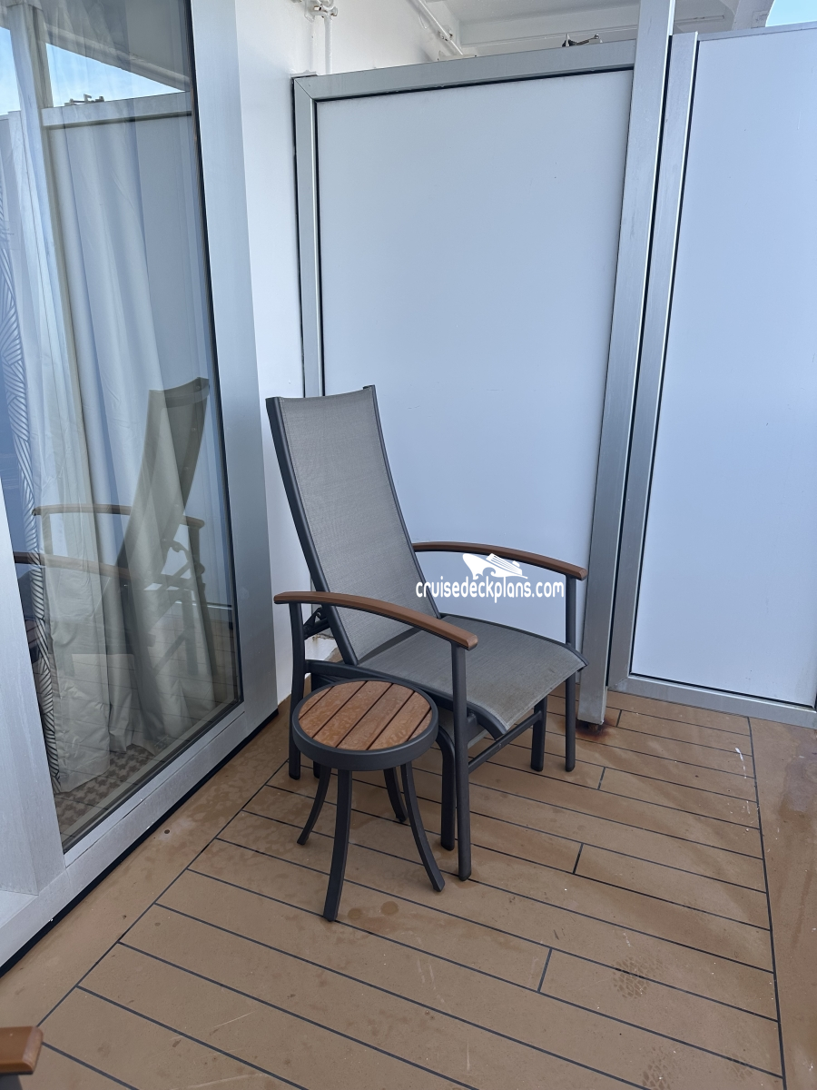 Balcony is 5.5 feet deep. Category VQ on Observation deck has a small narrow balcony . Indented balconies on deck 5 (where the deck is narrow) are 4.5 feet deep.