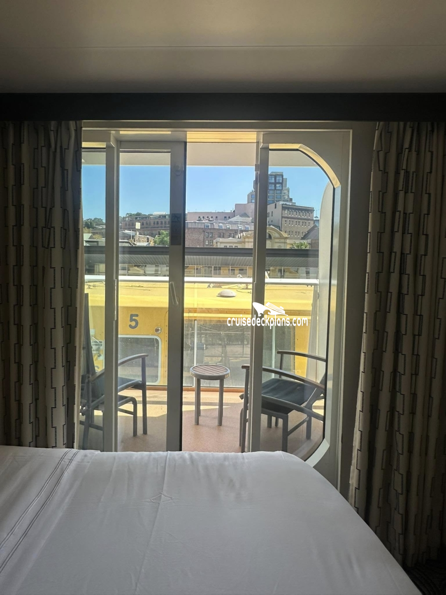 2C (was D1) balconies range from 55 to 119 square feet. Cabins 6254, 6258, 6654, 6658, 7254, 7258, 7654, 7658 have a chair instead of sofa and are 177 square feet with 82 square feet balconies. Category 1E and 2E (was DO) and 2F (was SB) is obstructed by view of top of lifeboat. Forward category 2E (was DO) on deck 7 and deck 8 is obstructed by steel frame that forms porthole opening. Some cabins have sofa near the balcony and others have bed near the balcony.