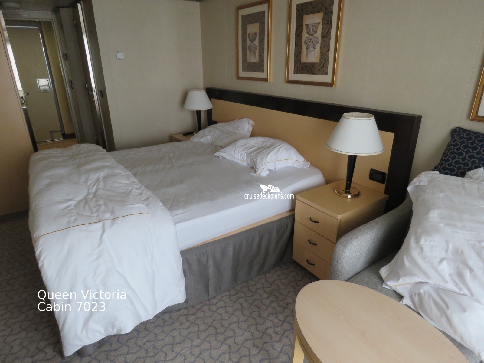 These are some actual stateroom pictures of cabin 7023 on the Queen Victoria. Click on images below for larger image and slide show. The slide show will show the date the picture was uploaded to out website. This date is useful because Queen Victoria typically will update its cabins every three to five years with new carpeting and decor. We will keep older pictures for you to compare the more recent photos to. The pictures are sorted by the newest ones first. Most of our cabin pictures are contributed by actual cruisers. We pay 50 cents for any that we use. You can upload your cabin photos HERE. Afer you are done looking at these photos and/or the videos below you can click here to select another cabin.
